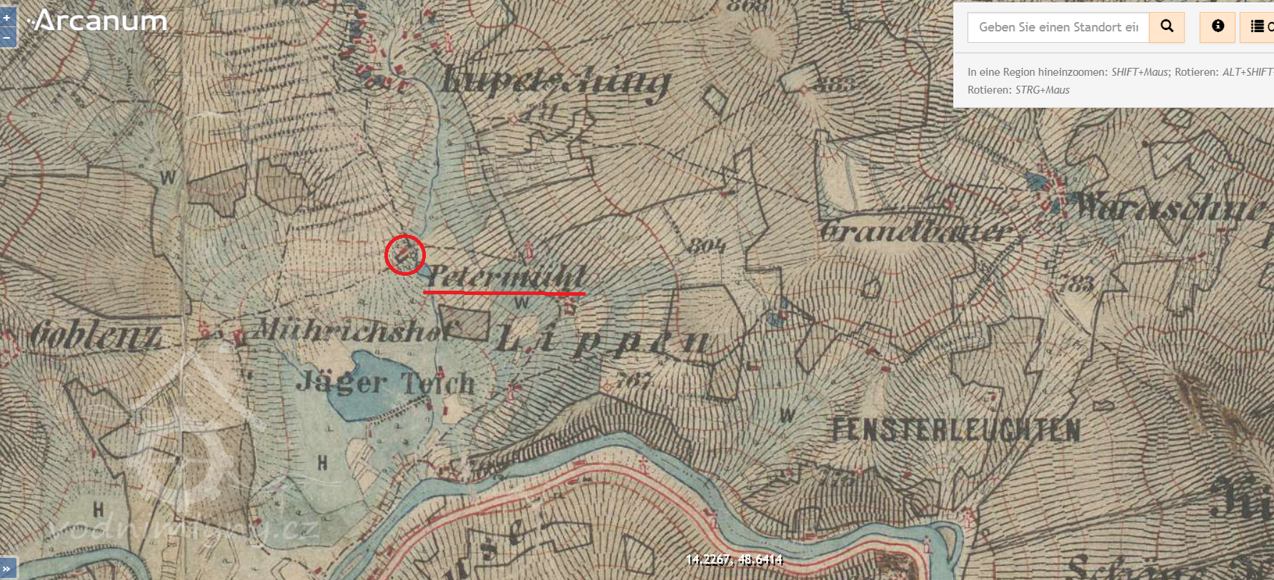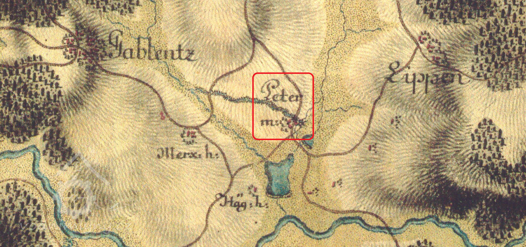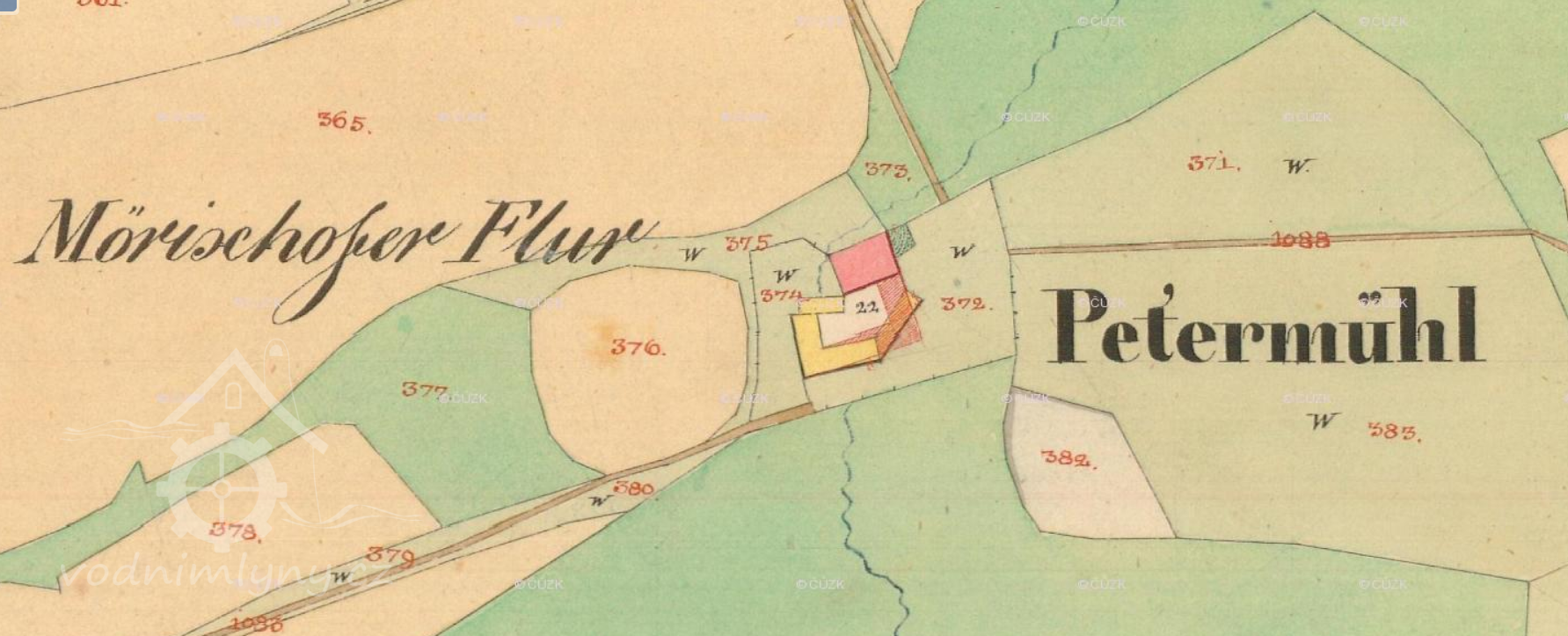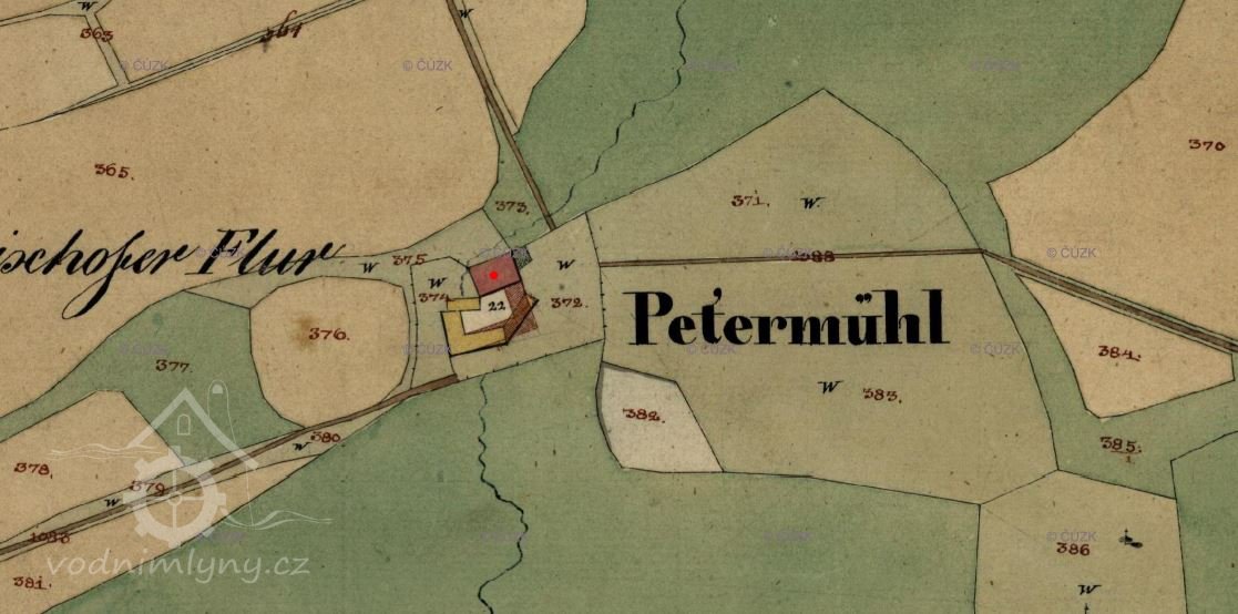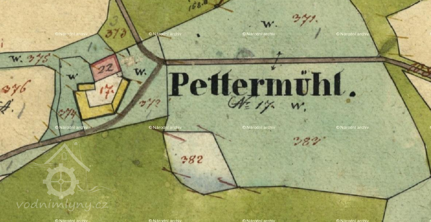 Petrův mlýn je zmiňován již v urbáři vyšebrodského klášterního majetku z roku 1530. Zde je pod vsí Slupečná (v originále latinsky Lupoczing, něm. Lupetsching) v pořadí jako 11. uvedena jako relativně samostatná usedlost a mlýn Petermuhle mlynáře Petra (v originále latinsky "Peter molendinator sub Lupoczing"), u něhož jsou zapsány povinné platby jak za grunt tak za mlýn (v orig. "de molendino et feodo"). Zda to byl úplně první mlynář, podle kterého mlýn nese i své jméno, není zřejmé. Jako další vlastníci mlýna (lépe řečeno další osoby na mlýně osedlé jsou Philippové - pravděpodobně otec a pak syn se stejným jménem s datací zápisu 1572 a 1601 - urbář v edici z roku 1896, jejímž autorem je Dr. P. Valentin Schmidt - v online verzi např. na stránkách Landesbibliothek Oberoesterreich v Linci). (PK via RZ)