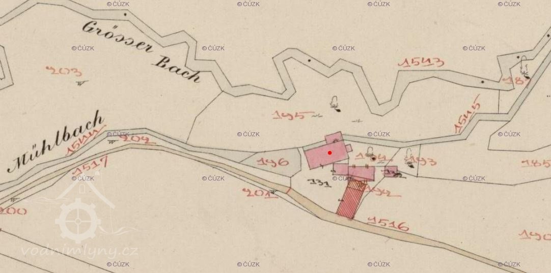 1937: dřevěné lopatkové kolo o ø 3,75 m a má 48 lopatek. Lopatky jsou 0,83 m dlouhé a zhruba 0,35 m široké. Spád 4,12 m.