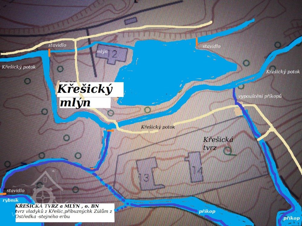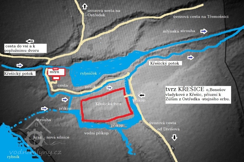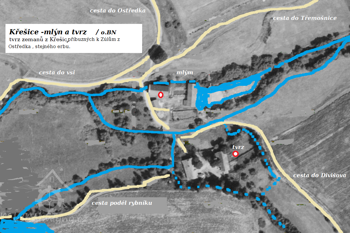 Mlýn údajně stojí na místě staré tvrze, z níž zbyl pouze sklep a kus silné zdi. Bývalo zde sídlo vladyk řečených z Křešic, spřízněných s vladykami z Ostředka, Petrovic a Zdebuzevsi. K roku 1380 se připomíná Jarek z Křešic.