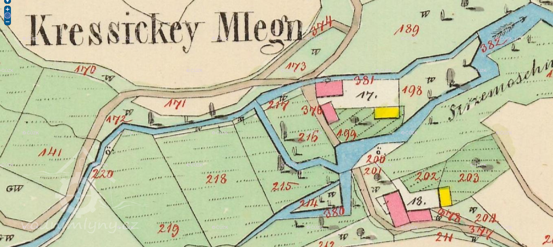 1930: 1 kolo na svrchní vodu, hltnost 0,124 m3/s, spád 4,9 m, výkon 5,25 HP