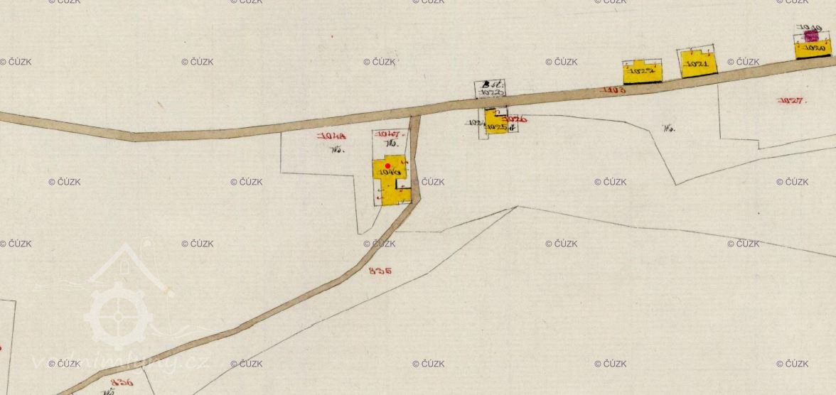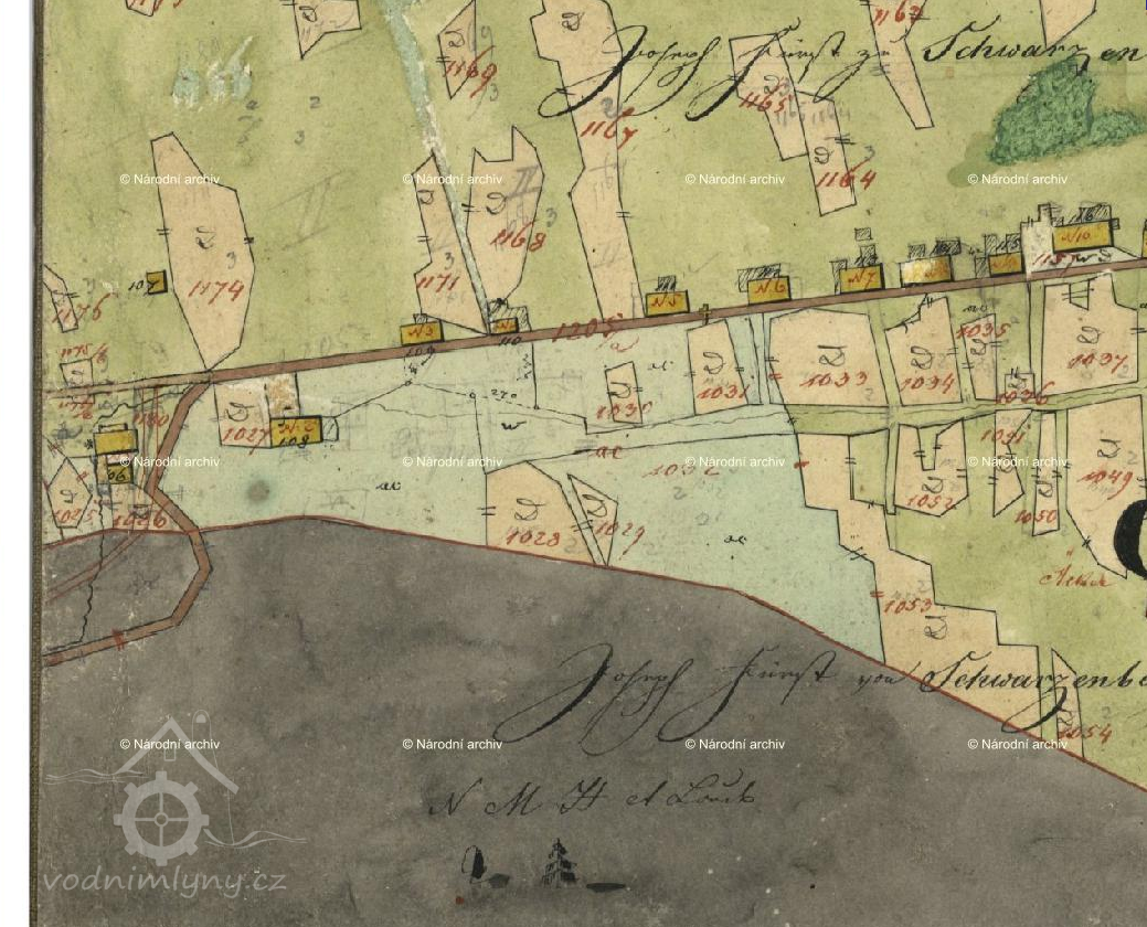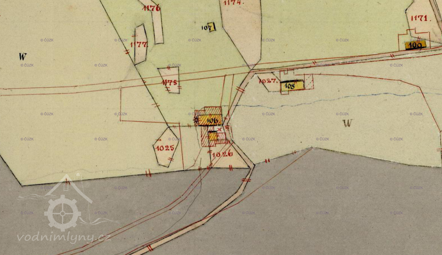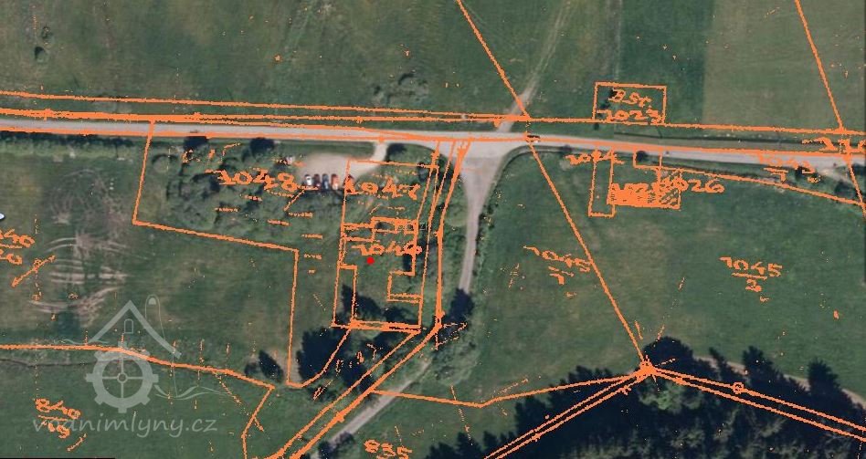 Schulzův mlýn,v listinách označovaný též jako "Mahlmühle NC.1 in Guthausen" je zobrazen na mapě Stabilního katastru:Čechy-0979-1-České Žleby.Na starším výtisku mapy/zobrazen na této stránce/ má stav.parcela číslo 106- viz.mapový list číslo 009.Na novější mapě/ mapový list číslo 010/ je zobrazena stejná parcela, po přečíslování označená jako st.p. 1046.