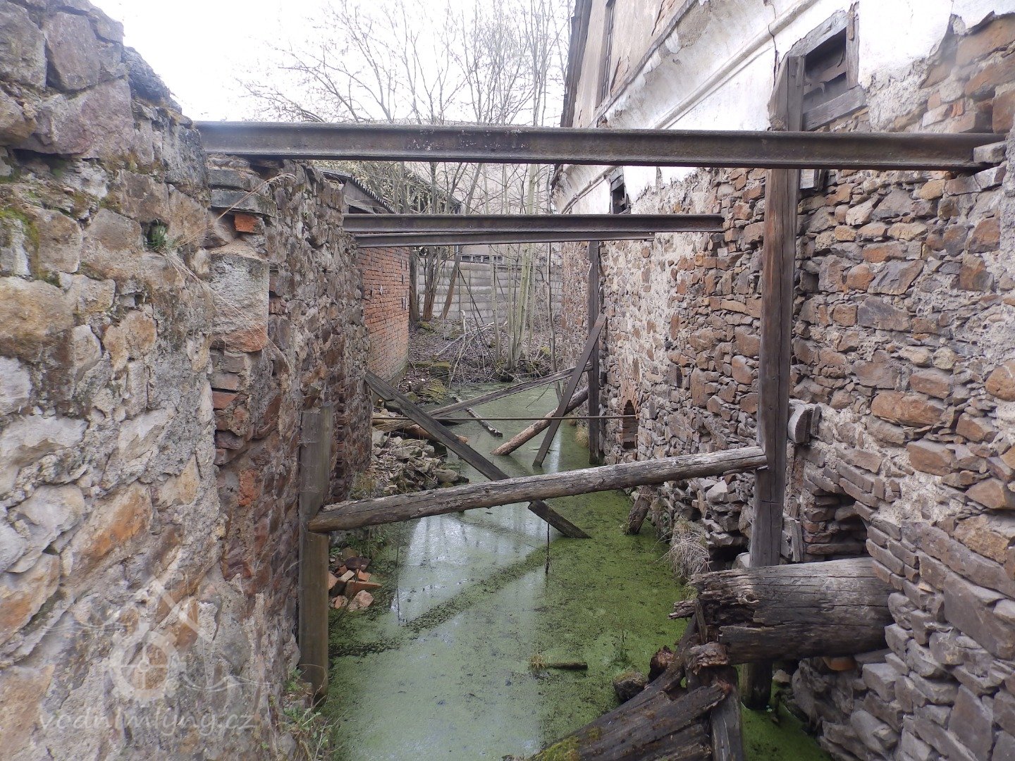 na svrchní vodu, ještě před tím než všechna 3 kola byla převedena na spodní vodu. Technicky to bylo vyřešeno tak, že voda z nádrže „U Krajana“ vytékala zprvu strouhou, a tam kde se terén již svažoval, tekla dřevěnými vantroky postavenými na sloupech, ve výšce, která umožňovala i podjetí naloženého vozu. Vantroky byly vedeny i přes 2 kola na spodní vodu, o čemž svědčí dodnes existující konstrukce nad takzvanou lednicí.