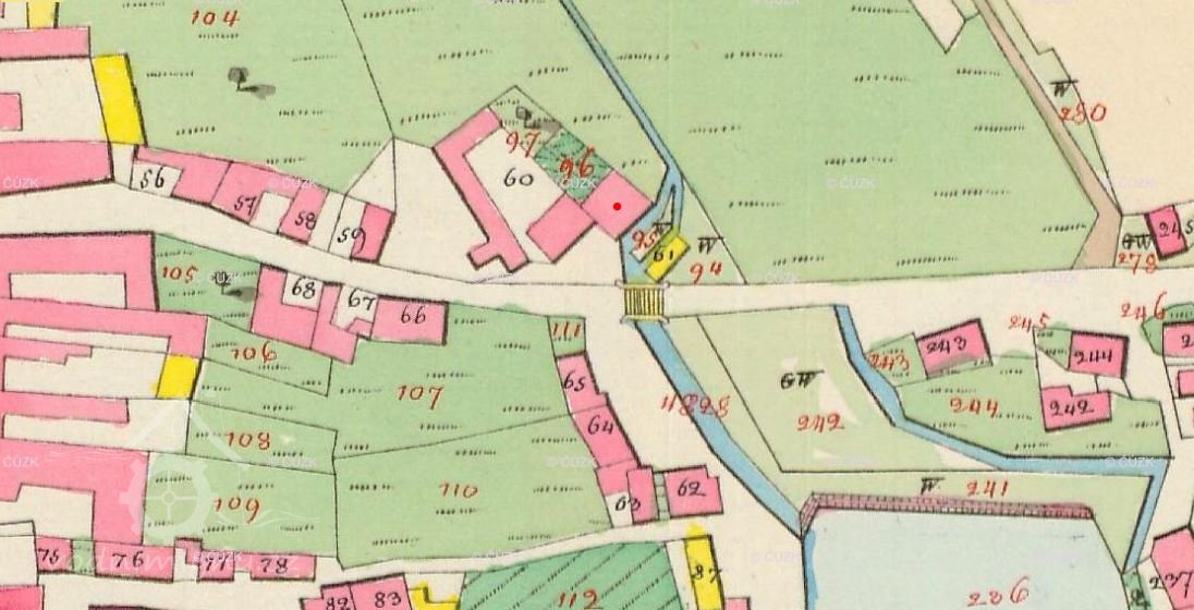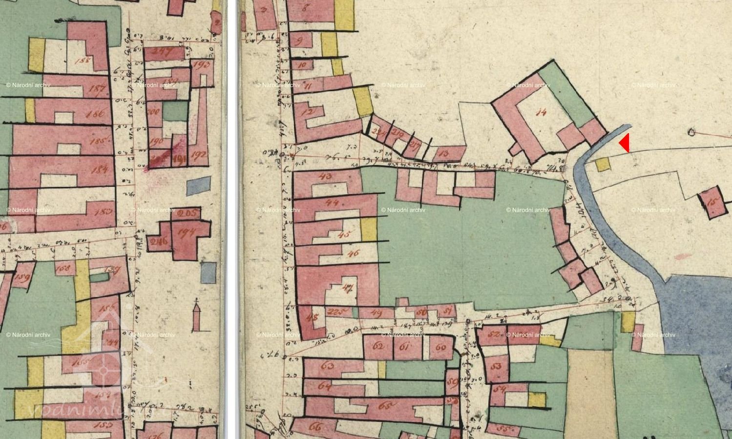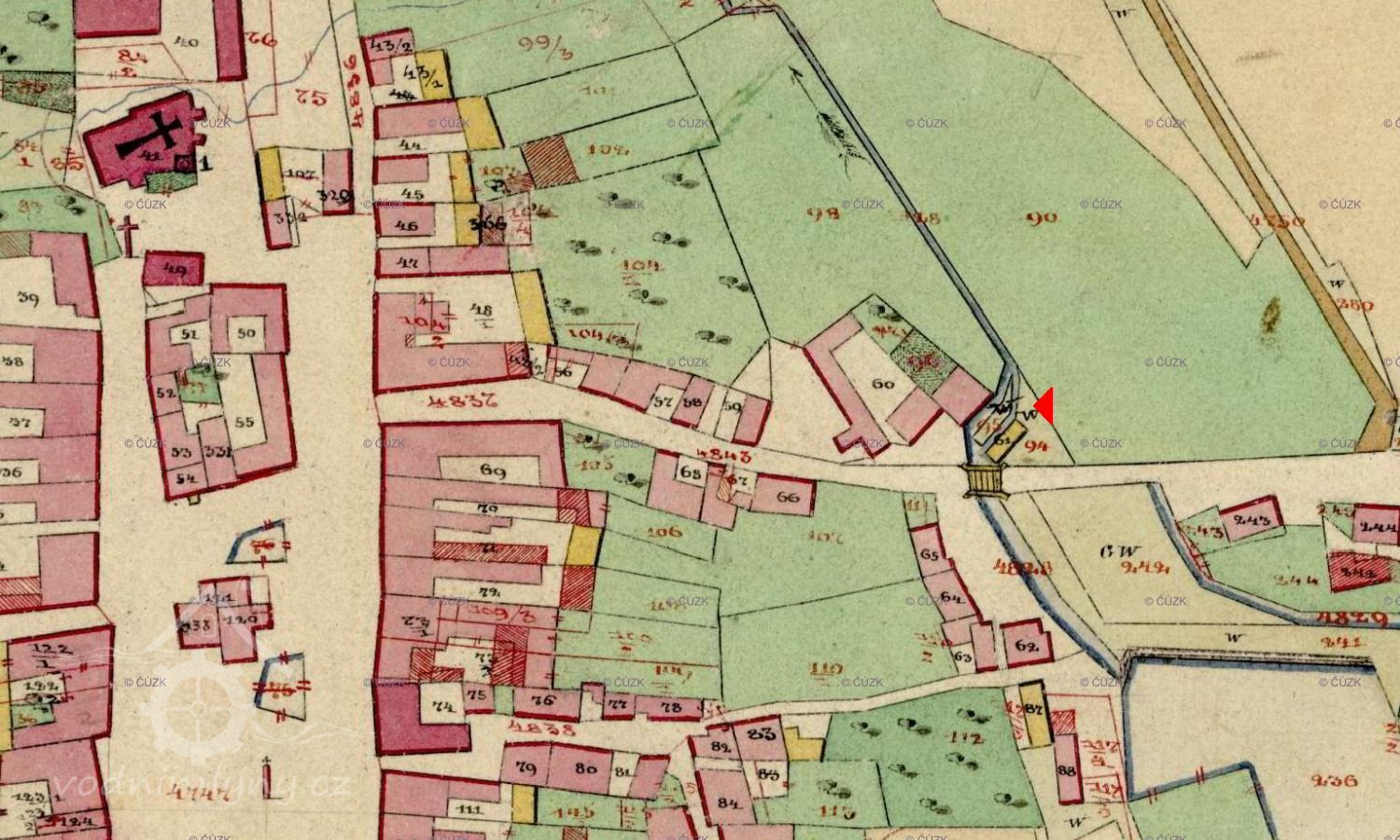 Na počátku mlýnské stoky 1 m široké 0,62 m hl. upouštěcí stavidlo. Splav pro zbytečnou vodu zaopatřen jest 3 stavidly á 1,3 m, 1,37 m, 1,48 m šir. Vantroky u mlýna 4 m dl. 1,58 m šir. 0,66 m hl. s 3 stavidly á 0,26 m šir. 0,30 m hl. i 0,29 m šir. 0,31 m hl. k mlýnským složením prostřední 0,26 m šir. 0,30 m hl. k stoupám slouží. Vantroky k pile jsou 9 m dl. 0,53 m šir. 0,33 m hl., stavidla 0,38 m vys. 0,60 m šir.