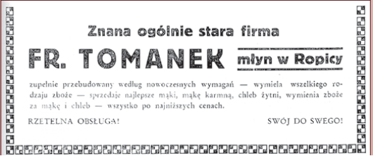 Podle urbáře z roku 1770 byli v Ropici tři mlynáři: Adam Tomanek, Jan Tomanek a Pavel Tomanek, kteří byli osvobozeni od roboty.