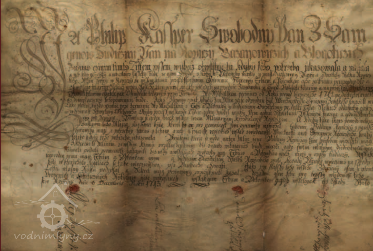 List z 6. 12. 1713: Filip sv.p. ze Saint Genois prodal Jiřímu Fuxovi a jeho potomkům Horní mlýn se vším příslušenstvím za 180 slezských tolarů. Kupující má povinnost platit každoročně jednou týdně čtvrt měrky pšenice pro semeno.