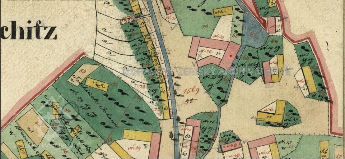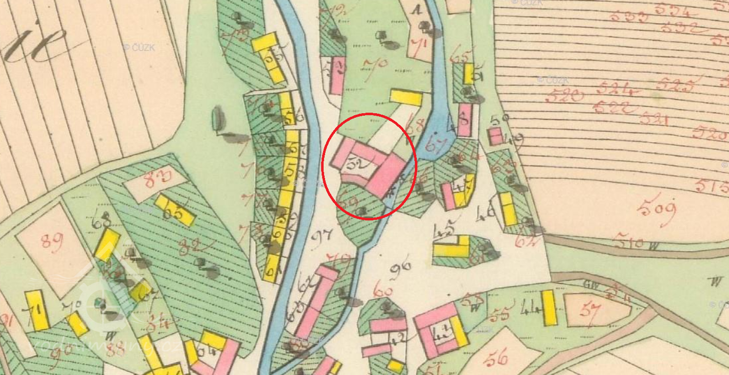 1909 v čp. 14 mlýn Stiskálků, stojící mezi domem Lukašíkovým a Hlavicovým