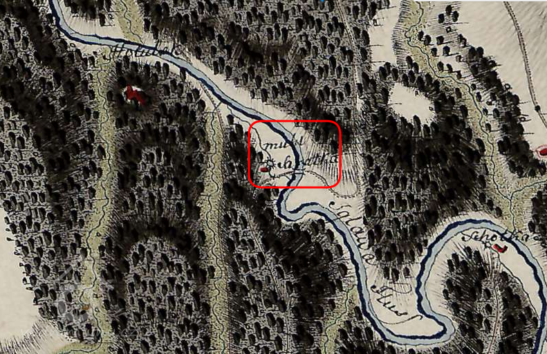 Mlýn na mapě I. voj. mapování, 1764-1768, © http://oldmaps.geolab.cz/