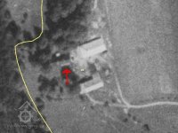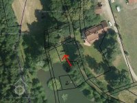 Katastrální mapa na podkladu leteckého snímkování, Krims Mühle stál vpravo od silnice, vlevo od silnice stojí hostinec Krimz, 2010, © kontaminace.cenia.cz