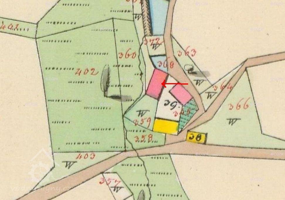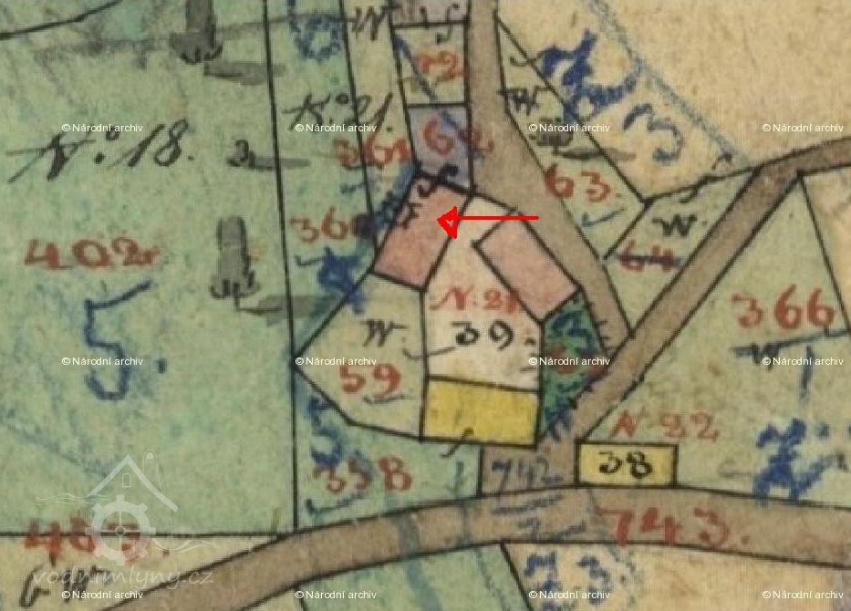 Obere Mühle-Horní mlýn Pavlov čp. 21, p.č.st.39, 1838, © Indikační skica, výřez,archivnimapy.cuzk.cz