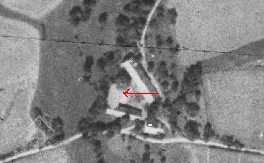 V r.1953 se zde žádné budovy již nenacházejí;mlýn zbourán ve 30.letech 20.stol., 1953, © kontaminace.cenia.cz