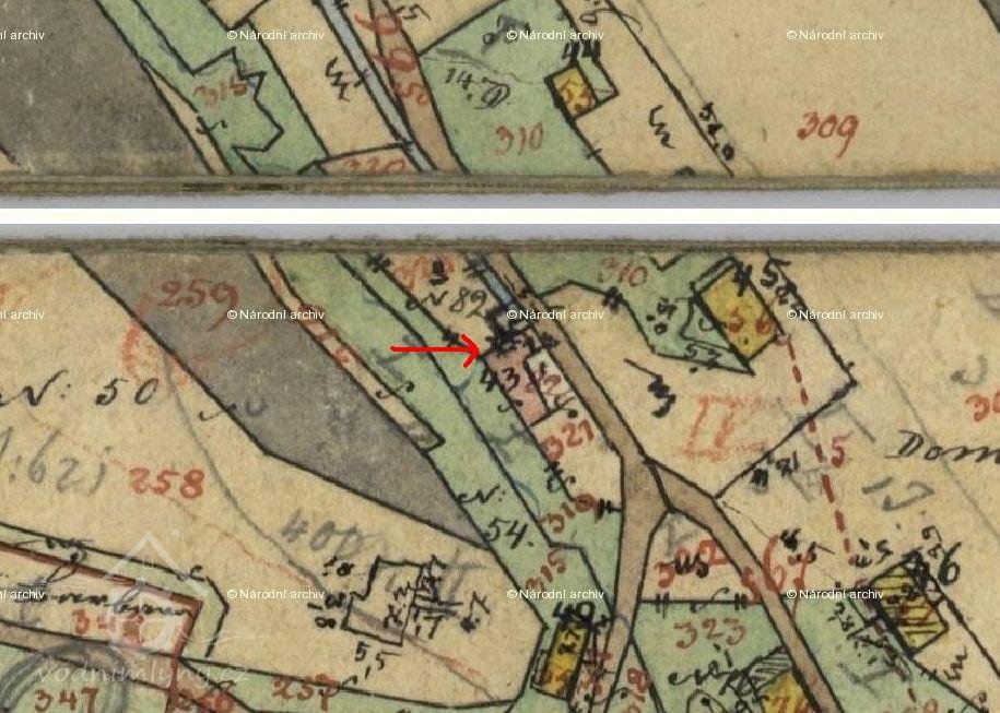 Indikační skica, výřez. Dolní, Špitálský mlýn v Trutnově čp.7, p.č.st. 361, východně od něj je ústí Kryblického potoka do Úpy, 1841, © archivnimapy.cuzk.cz