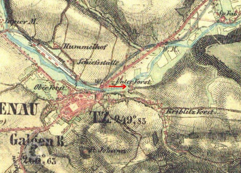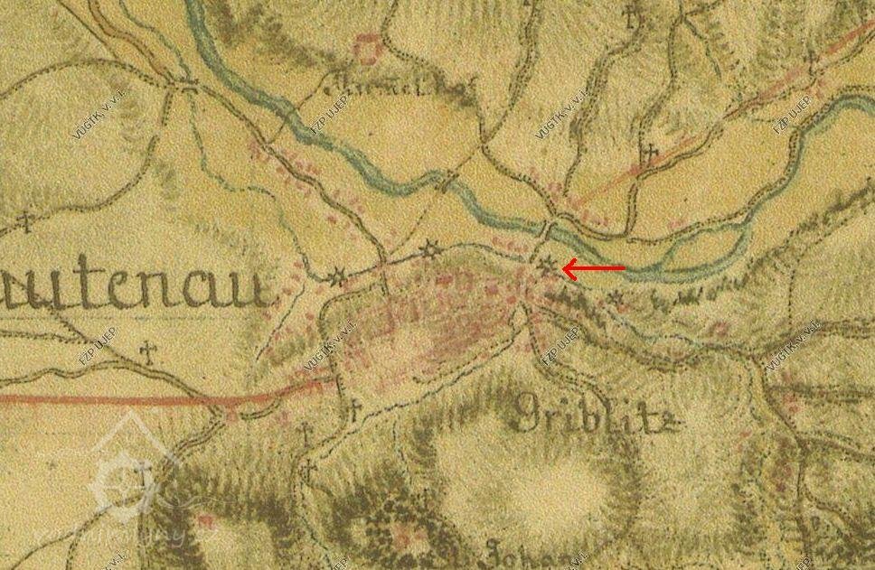 Mlýn u Dolního zámku v Teplicích n.M., 1764-68, © I.vojenské mapování, výřez, oldmaps.geolab.cz