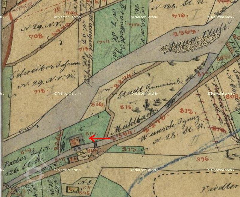 Císařský povinný otisk,výřez. Dolní, Špitálský mlýn v Trutnově čp.7, p.č.st.361-východně od ústí Kryblického potoka do Úpy, 1841, © archivnimapy.cuzk.cz
