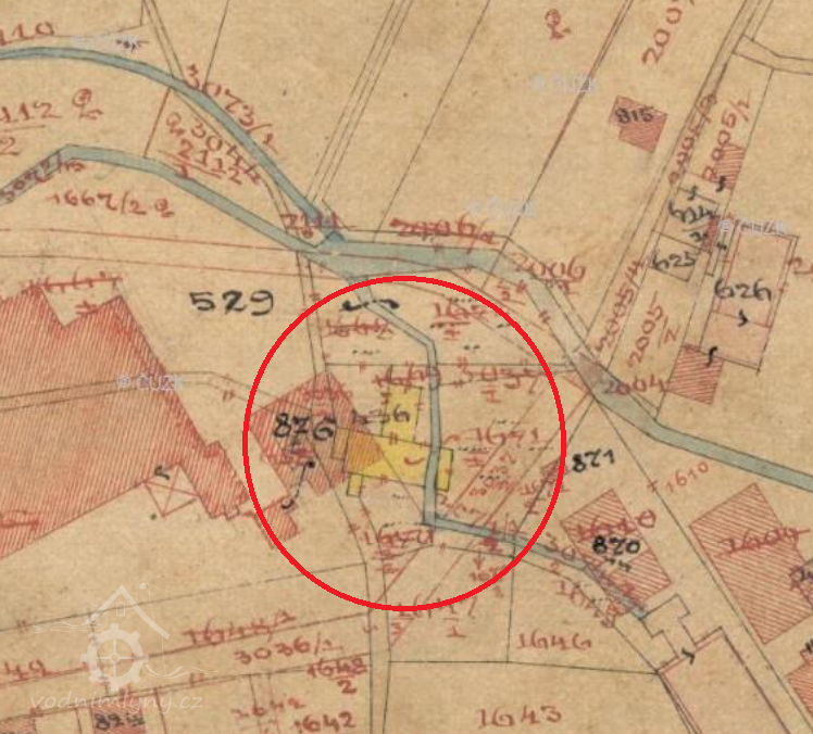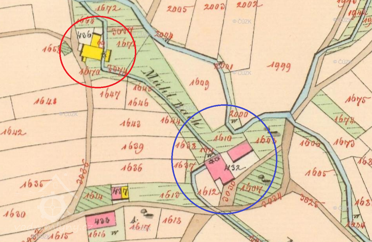 1757 Tereziánský katastr dominikál: 2 mlýny po 1 kole na nestálé vodě