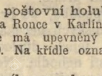 1896 odchycen ve mlýně poštovní holub z Hamburku. (RR)