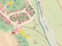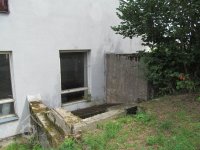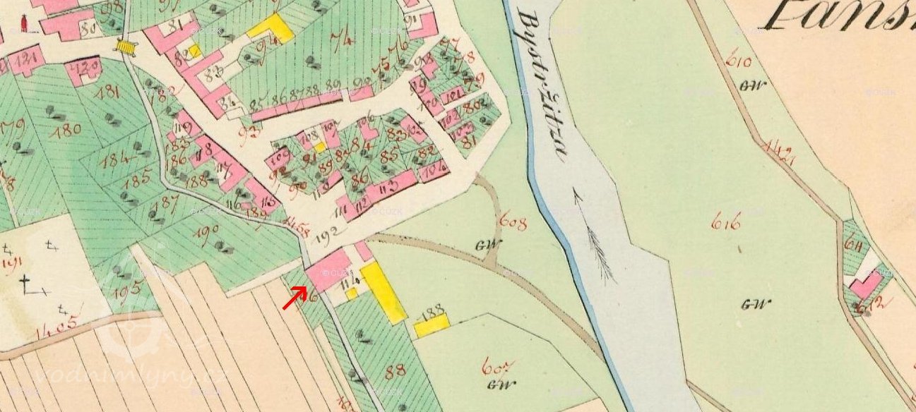Vodní náhon od mlýna Debrného, u západní stěny budovy dosud patrné vodní dílo pro pohon turbínou se stavidly, kašnou a zbytky česlí