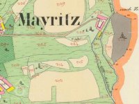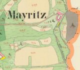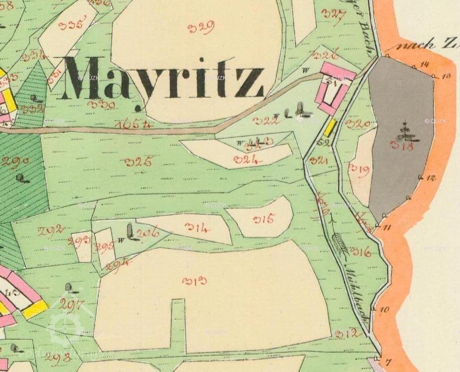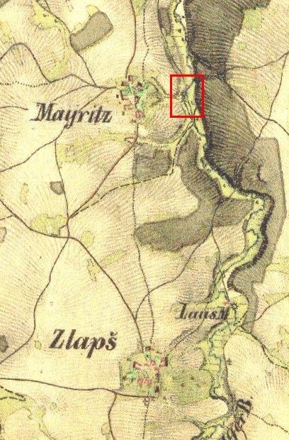 Mlýn jako takový zde nemá pojmenování a ani nemá vyznačeno mlýnské kolo - dle informací níže, zde byl provoz zřízen až po třetině 19. století (resp. na začátku 60. let) a původně šlo o statek. Velmi dobře zde ovšem vidíme mlýnský náhon ? Dobře je patrná i příjezdová úvozová cesta od Mohuřic (Mayritz), která pokračuje do prudkého svahu dále "nach Zitzkreitz". Základ tvoří usedlost téměř obdélného tvaru (růžové kamenné-obytné), otevřená pod horní budovou na obě strany (průchodem-průjezdem ?, což ovšem není dnes již znát). Jižněji stojí samostatně podlouhlá zřejmě zemědělská budova, přiléhající k náhonu, resp na poloostrově mezi potokem a náhonem (žluté dřevěné-zemědělské). V okolí jsou opět klasicky pastviny, ovšem zde již souvislejší v podobě lehce kosého obdélníku. Jihozápadně mlýna zřejmě byly osamělé, možná i ovocné, stromy.