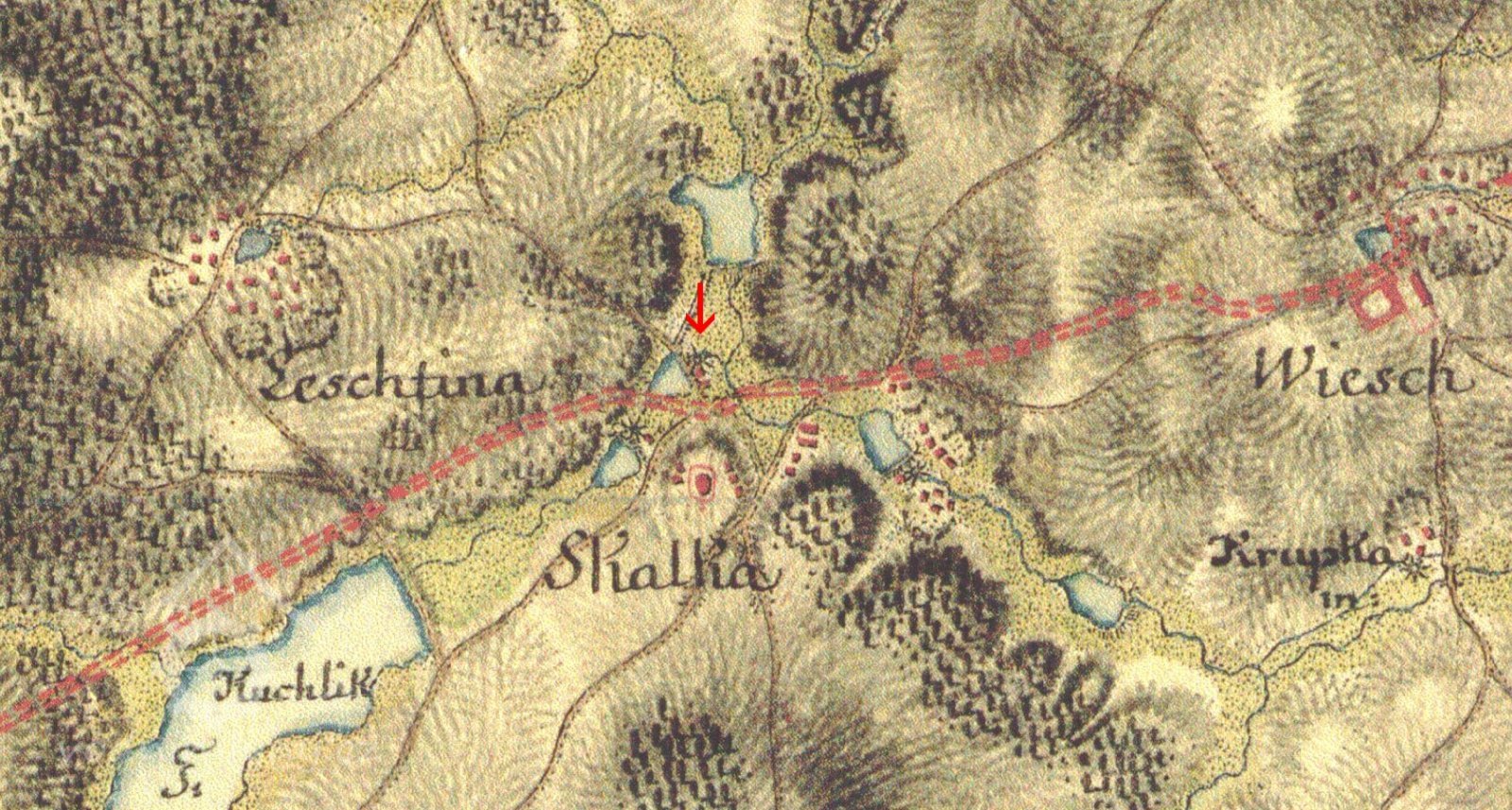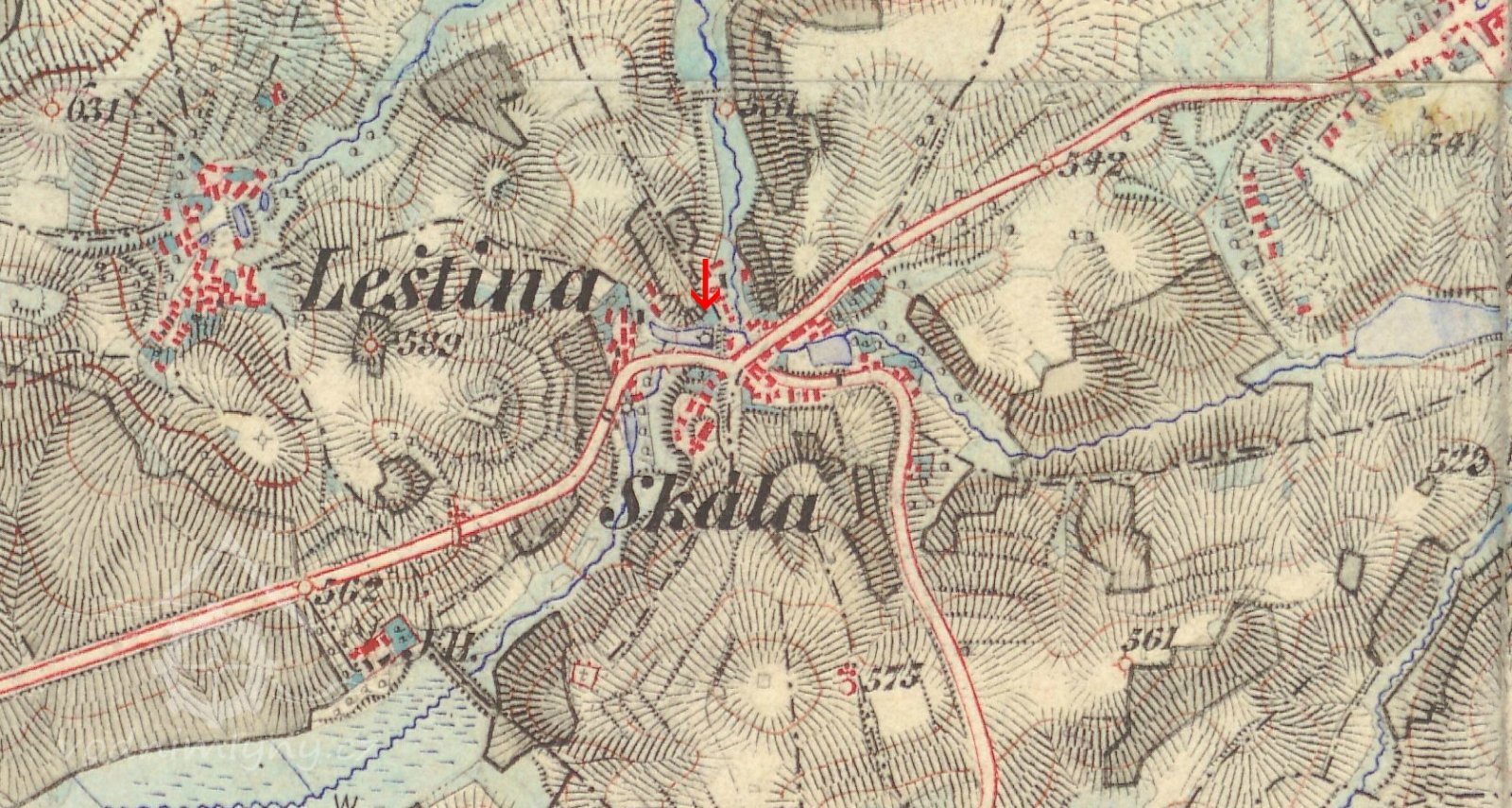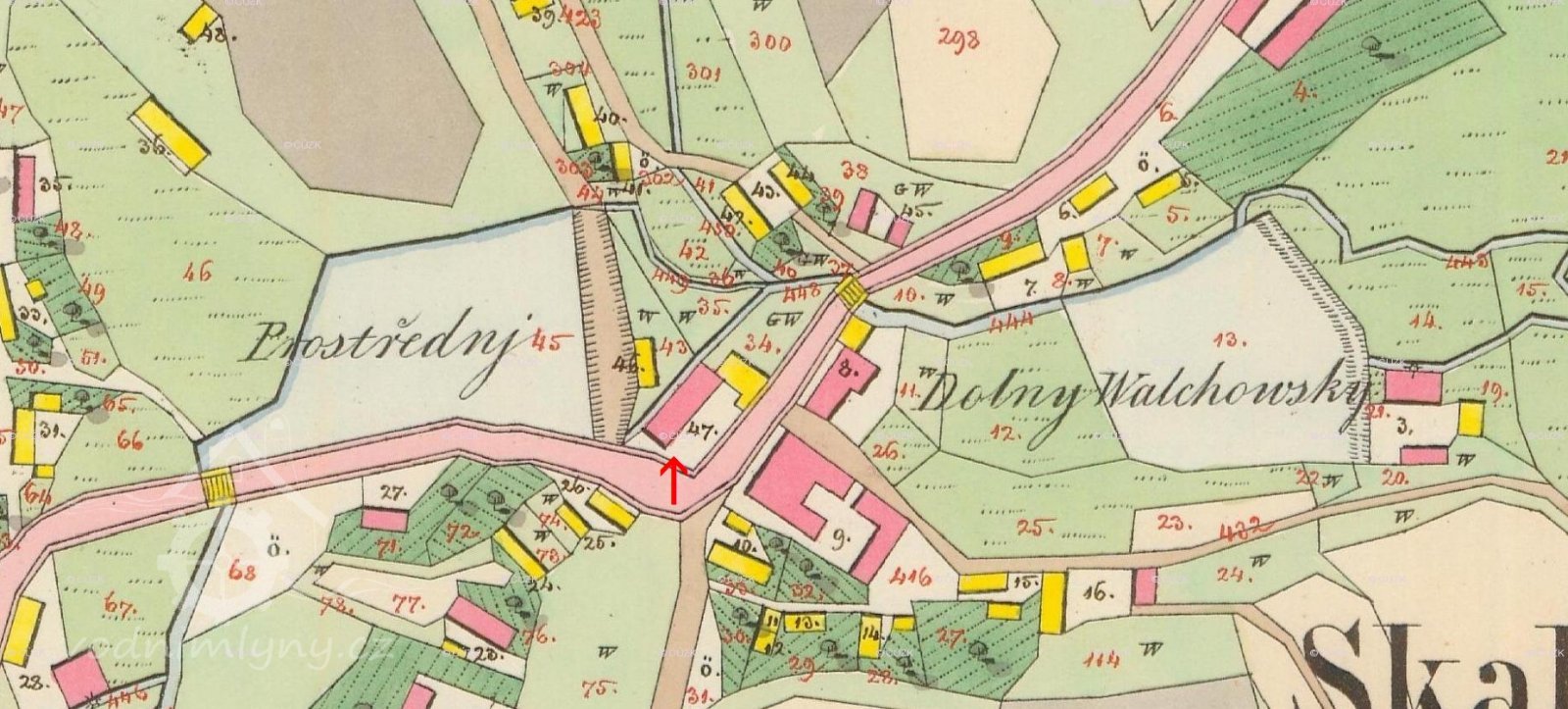 Mlýn čp.11 ve Skále nalézá se pod rybníkem č.parc.45 tzv. „prostřední“, do něhož vtéká odpadní voda z vodní nádržky mlýna čp.16 a pak voda z potoka veselského (kterážto poslední voda neprávem tam vtéká *))