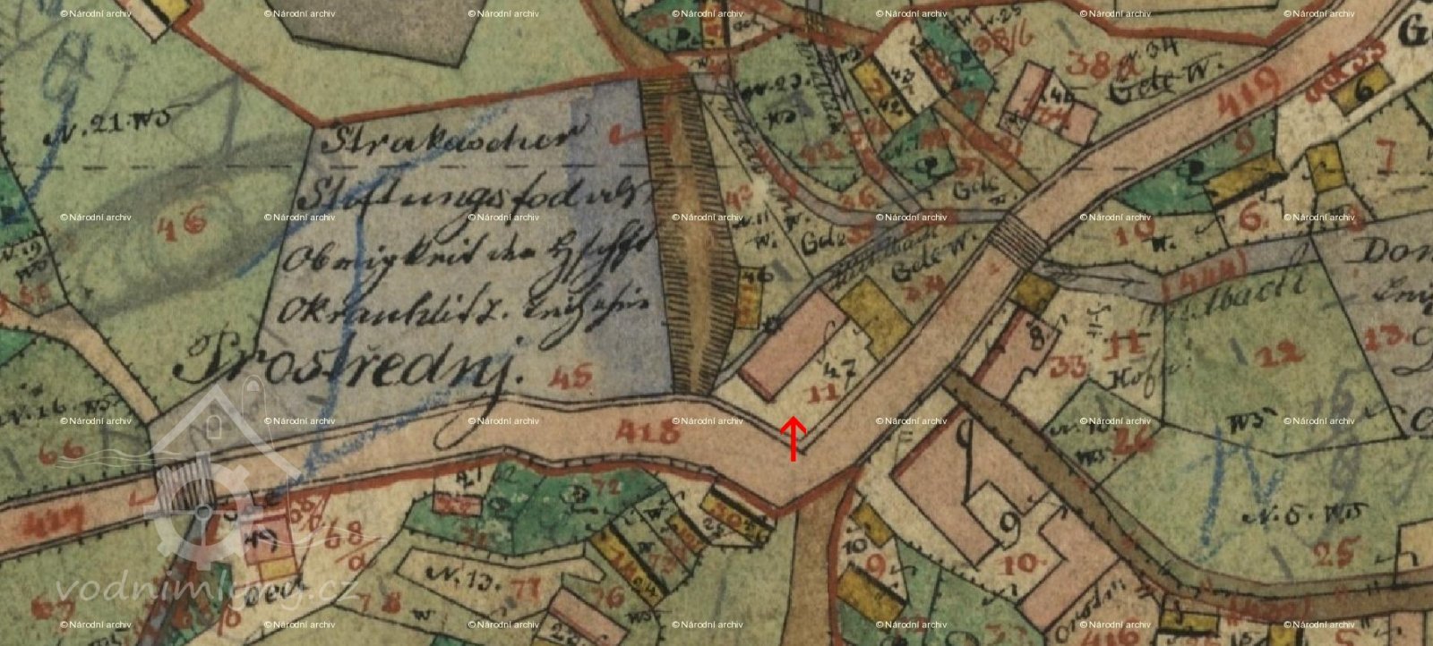 Popis 3 vodní kola na vrchní vodu. Horní a střední vodní kolo má průměr 3,65 m a šířku 0,66 m, dolní vodní kolo na stoupy má průměr 3,55 m a šířku 0,60 m. Pila stojící zvlášť má jedno vodní kolo na vrchní vodu o průměru 4 m a šířce 0,79 m.