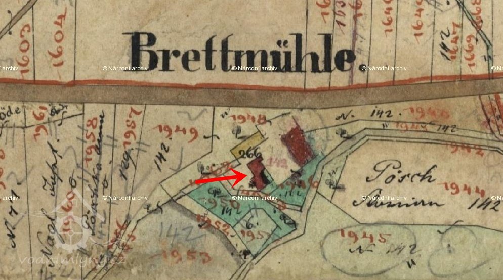 Mlýn čp. 142 je uveden na Seznamu a mapě vodních děl k roku 1930, mlynář – Julius Pösch.