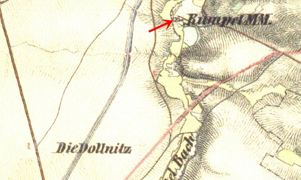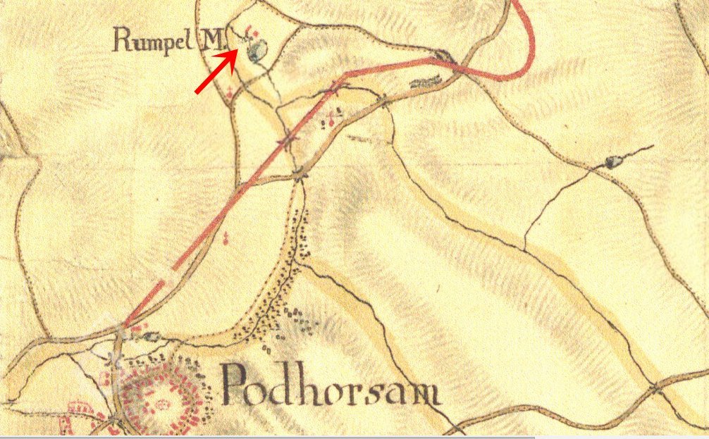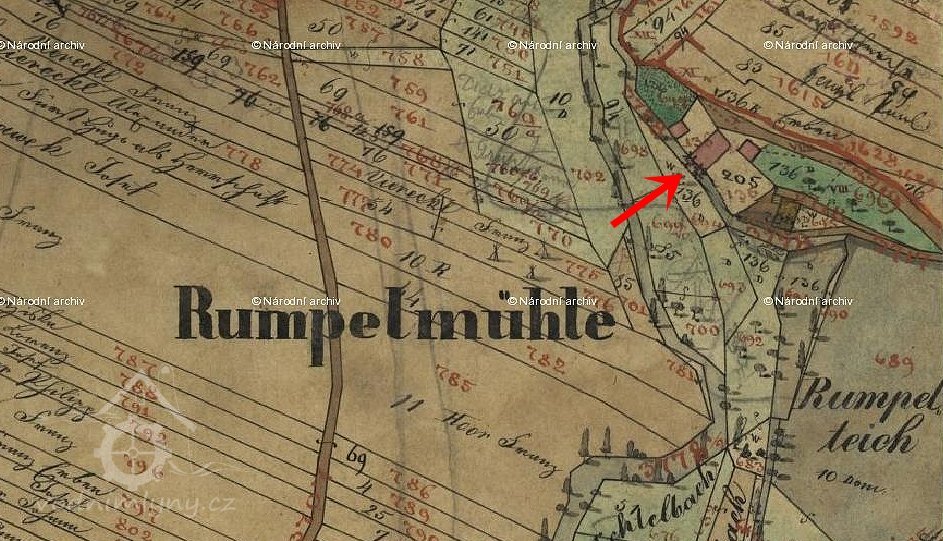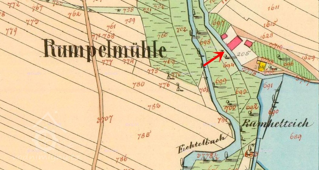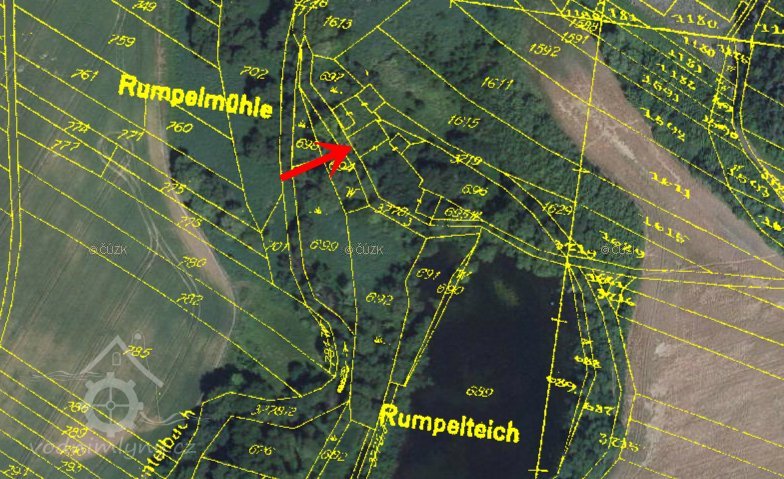 Zaniklý mlýn u Podbořan u rybníka Krcálu, dříve zvaného Rumplák (Rumpelteich).