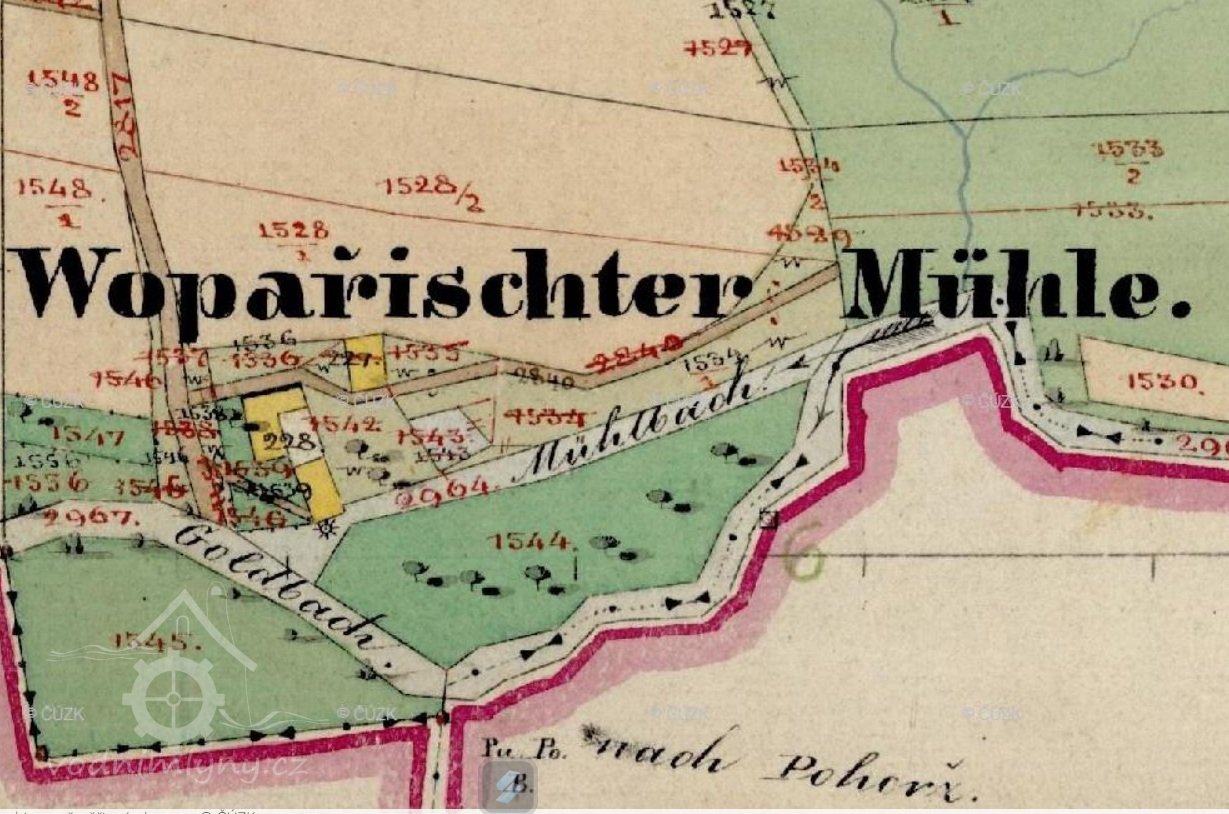 Mlýn Opařiště je vyznačen i na III. vojenském mapování, při mlýně byla i pila.