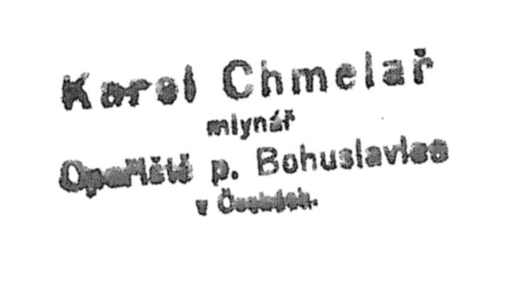 V roce 1900 je v matrice Bohuslavic uváděn jako mlynář Josef Chmelař, vnuk výše uvedeného mlynáře Václava Chmelaře.