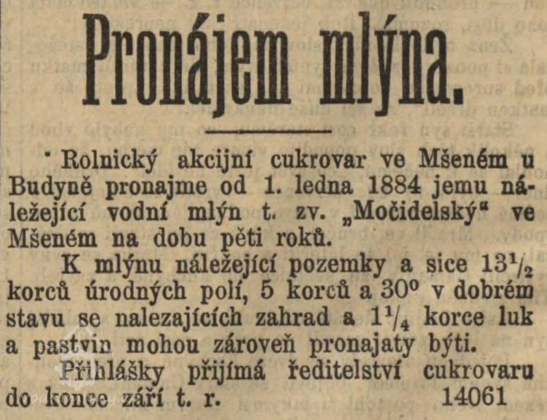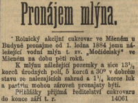 Od 1. ledna 1884 mlýn nabízen k pronájmu, majitel Rolnický akcijní cukrovar ve Mšeném. (RR)