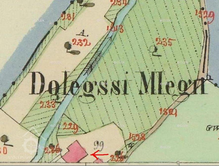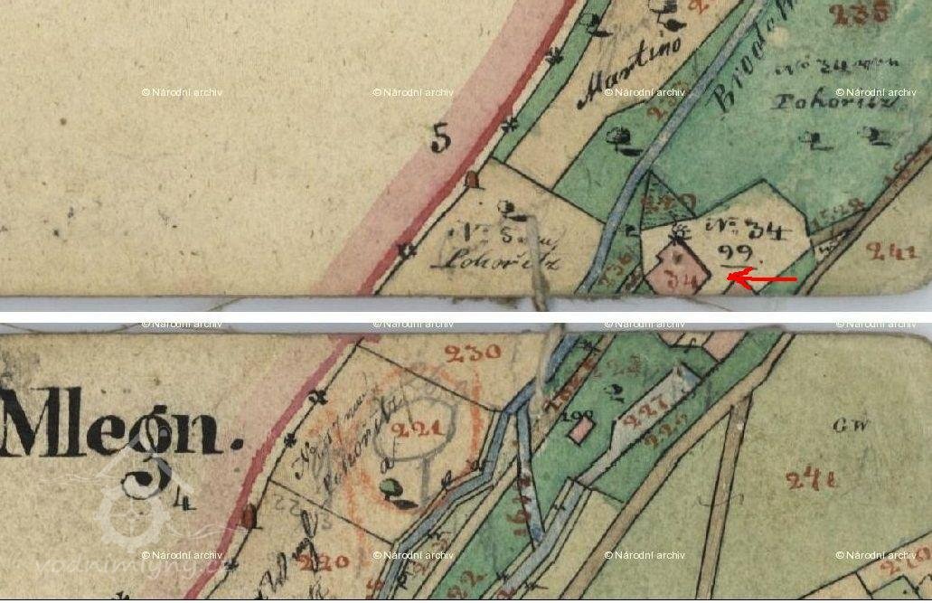 Mlýn je zakreslen na indikační skice i císařském otisku z roku 1840 jako zděná budova, obytná budova byla patrová, mlýnice samostatná o jednom kole. Objekt měl čp. 34 a stál na pozemku p.č.st. 99. V r. 1840 je jako majitel mlýna na indikační skice uveden Václav Stekert.