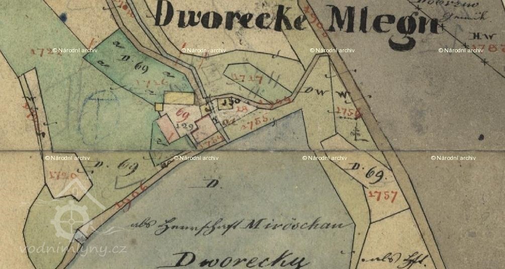 Z popsání všech duší na mirošovské faře z roku 1851, že mlýn ve Dvorci č.p. 69 měl pronajatý mlynář Vincenc Žaloudek. Bylo mu tehdy 41 let, byl ženat a měl 5 dětí. V té době se mlýn nacházel ve velmi špatném stavu. Ve školním archivu se nachází žádost 28. června 1848 cís. král. hospodářskému úřadu v Mirošově o vystavění bytu u tzv. mlejna Dvoreckého v Mirošově čp. 69 i se stavebním nástinem. Prosí aby mu bylo bezplatně k této stavbě dáno potřebné dříví.
