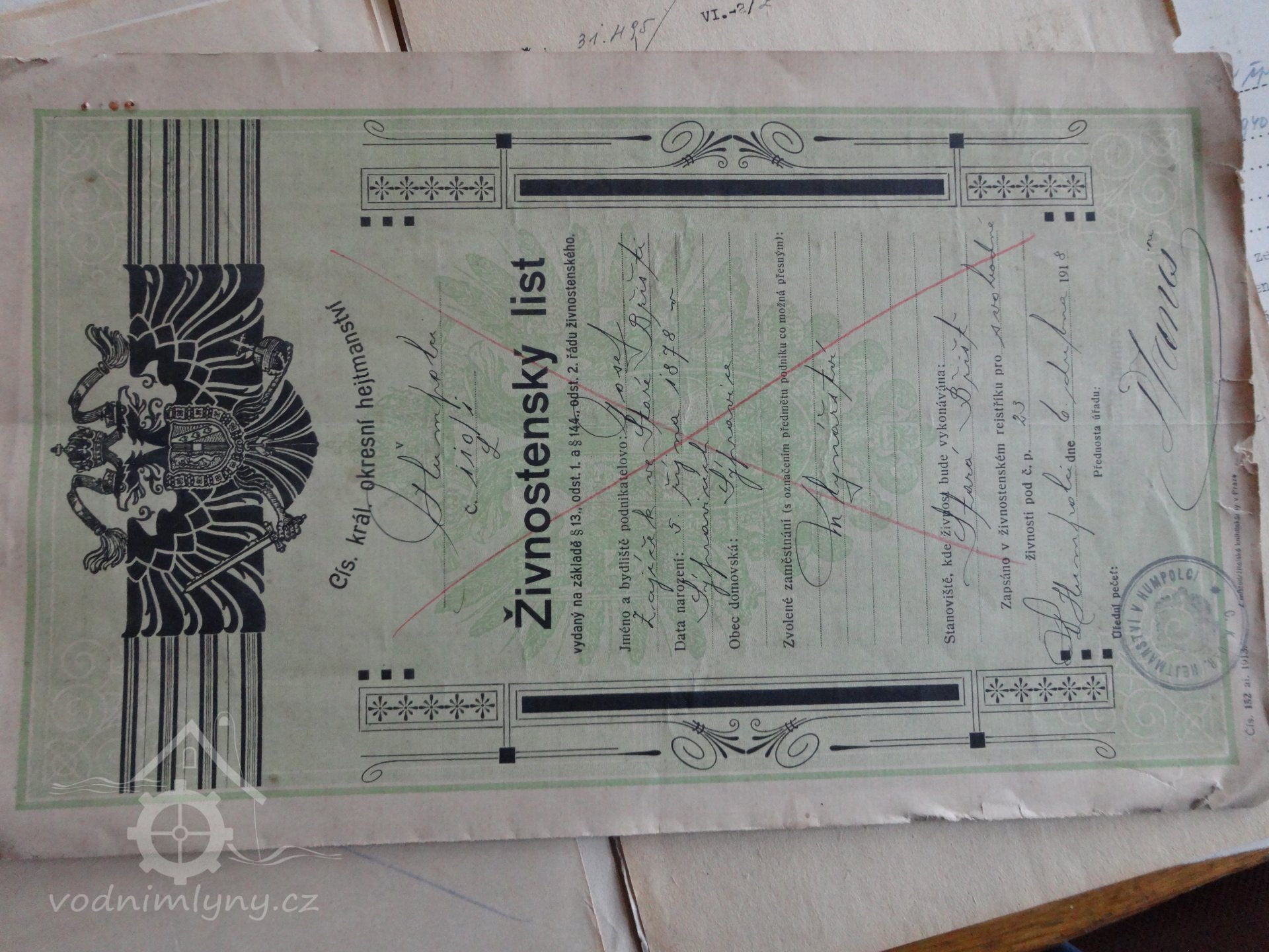 Dopis Josefa Zajíčka z 12.7.1917 c.k.okres.hejtmanství v Humpolci se žádostí o vydání živnostického listu. „Mlýn tento jakož i turbína schválena byla výměrem tohoto slavného úřadu ze dne 10.10.1916...“