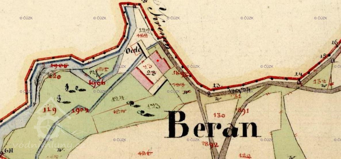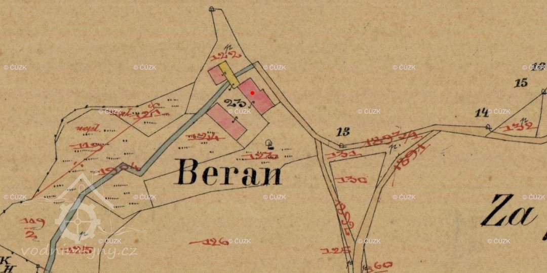 V pozemkových knihách je tento mlýn již na počátku 17. století zmiňován zápisem: "Václav Beránek po smrti Martina mimo podíl svůj a mimoto, co první platil, ještě zůstává za dvůr svůj doplatiti 33 kop vejruňky ročně. Při sv. Jiří léta 1603 klásti má po 5 kopách a to těmto náleží sirotkům po smrti Šimona Berana (vyjmenováni) po smrti Martina dluhů (vyjmenováni věřitelé), sirotkům (vyjmenováni)“. (Josef Beran)