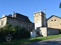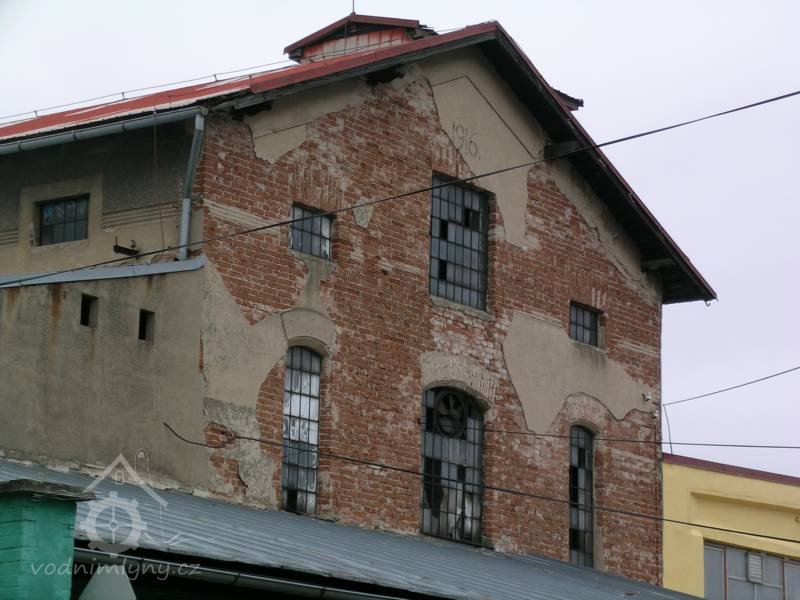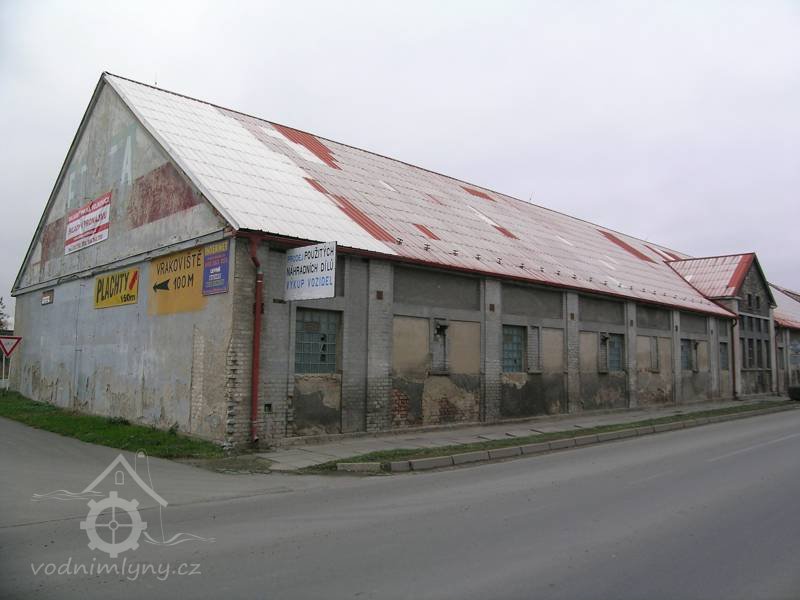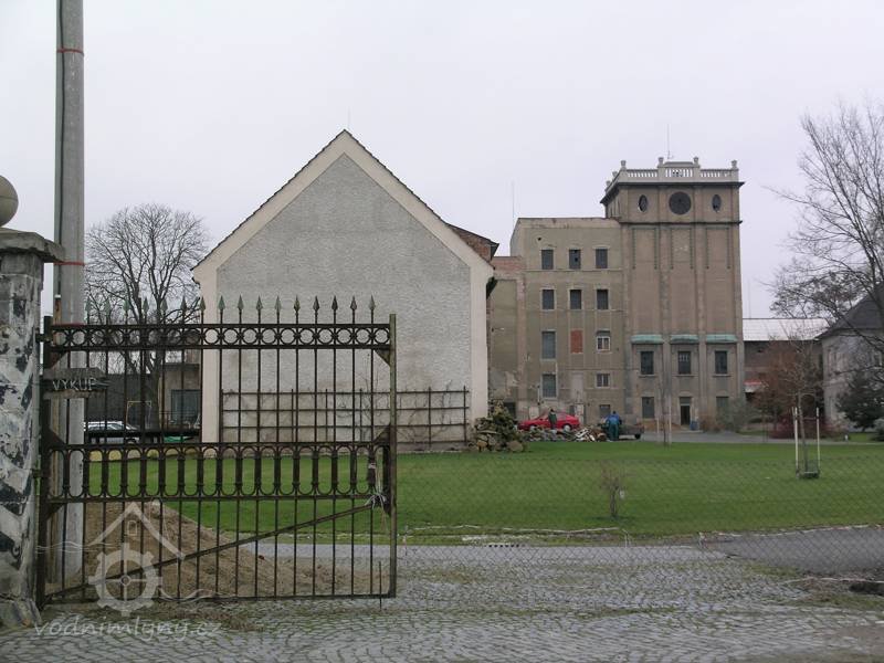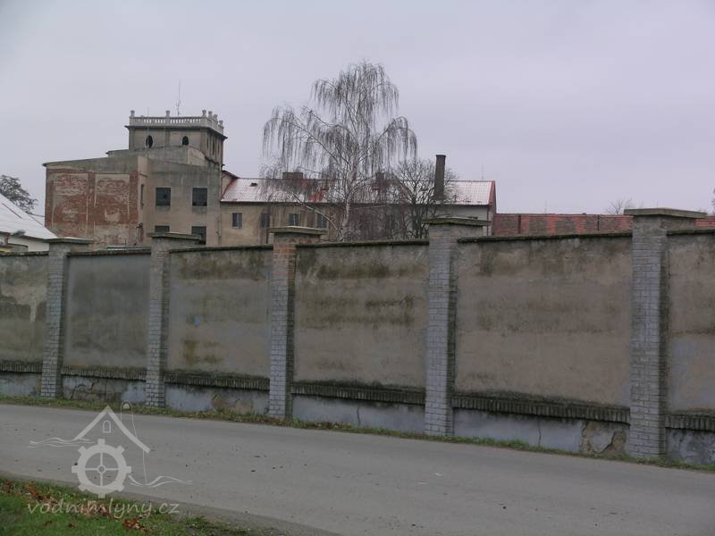 Vjezd do areálu a mlýn v pozadí, červenec 2016, © viz mapy.cz