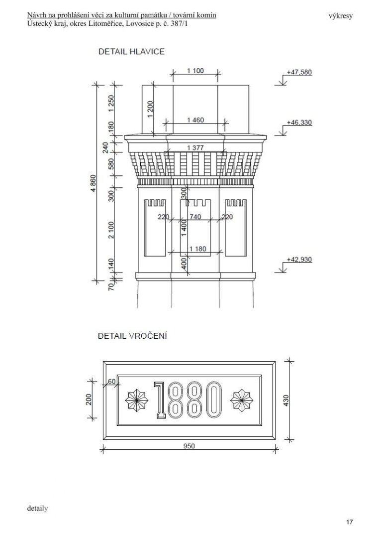 Komín je architektonizován jako sloup, rozčleněn na podstavec, prstenec (jako náznak patky), dřík a hlavici. Sloup má spíše egyptský než antický charakter, hlavice připomíná snad trochu lotosový květ se zavřeným kalichem, ale jen velmi vzdáleně. Podstavec (podnož) je širší, rovněž oktogonální, má kamenný sokl (patku). Nároží hmoty podstavce (kostky) zvýrazňují lizény, vodorovná horní lizéna je navíc vynesena zubořezem. Nad těmito lizénovými poli je další, tentokrát dvojstupňový zubořez krakorců z předsunutých cihel, který vynáší kamennou římsu (příklop). Ta ukončuje podstavec. Na podstavci stojí na (s dříkem shodně zděném) spodním prstenci hladký režný dřík. Ukončuje ho hlavice - nejprve (bez rozšíření) horním prstencem s omítnutými lizénovými rámy (horní lizénu podpírají vždy tři zuby zubořezu), poté ozdobným odsazením z cihel kladených na bok (zakrývá ho obruč) na které dosedá krakorcový pás (každý druhý krakorec je z čela omítnutý, patrně z ozdobných důvodů). Krakorce umožňují vyložení poslední kamenné římsy, zděná koruna hlavice na ní je již užší, bez ozdob. Do výšky dále šikmo ční již jen čtyři prosté tyče hromosvodu. Plné cihly mají jednu barevnost, komín nemá pro novější komíny typické ornamenty vyskládané z vícebarevných dutinových cihel radiálek. Je odkázán pouze na působení pomocí plastického uspořádání, dvojbarevnost trochu supluje pouze skrovné užití omítky (u lizén a krakorců hlavice), je však otázka, zda je toto omítnutí původní. Ocelové obruče jsou natřené zeleně. Vertikála je zvenku ze severovýchodní strany pochozí pomocí žebříku ze stupadel. Stupadla jsou zazděná do každé páté spáry. Každé desáté stupadlo má za sebou bezpečnostní odpočívací oblouk (třmen). Severovýchod je patrně zvolen z důvodu převládajícího směru větru, aby bylo možné kontrolovat nejexponovanější tedy návětrnou část. Na tělese komína lze najít několik pozoruhodných detailů: zejména vročení * 1880 * zhotovené a zazděné do pole mezi lizénami na východní straně podstavce. Jde o keramickou obdélnou reliéfní desku. Dále malý bílý kulatý smaltovaný štítek s modrým číslem 1, co označoval již není jasné. Do podstavce je zabudováno ještě zcela utilitárně několik ocelových (dnes již zohýbaných) konzol.;