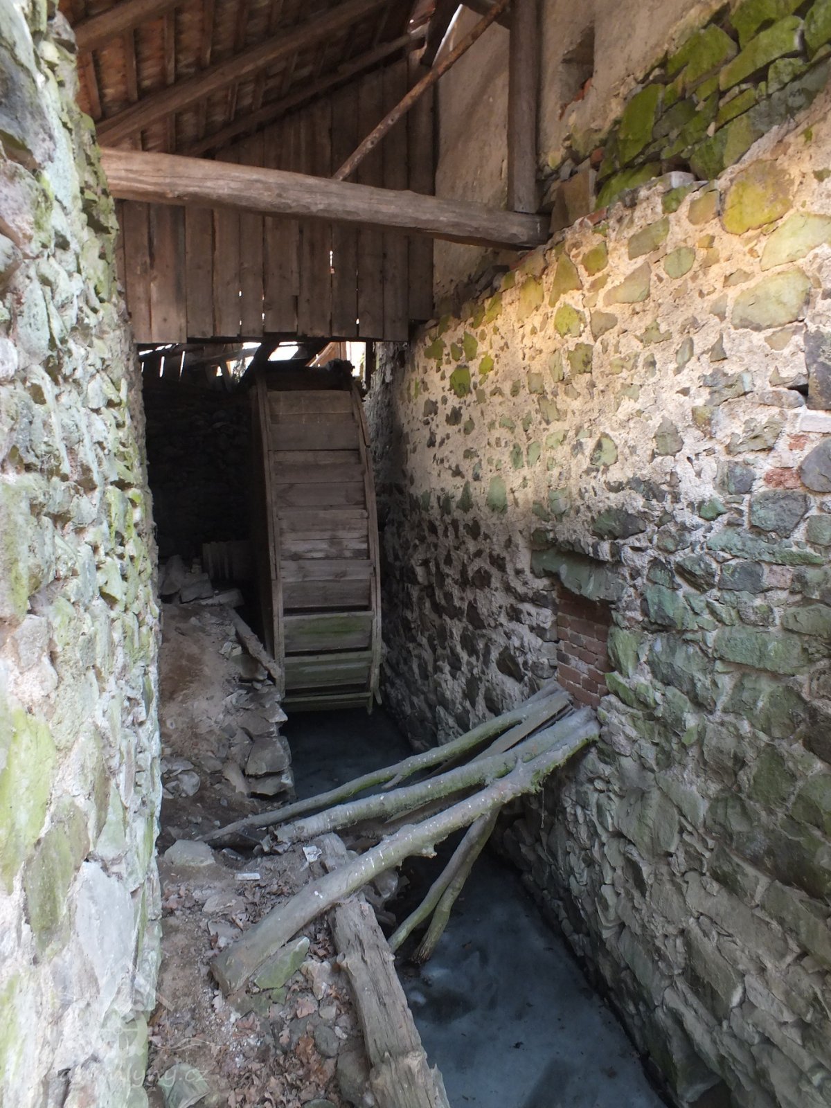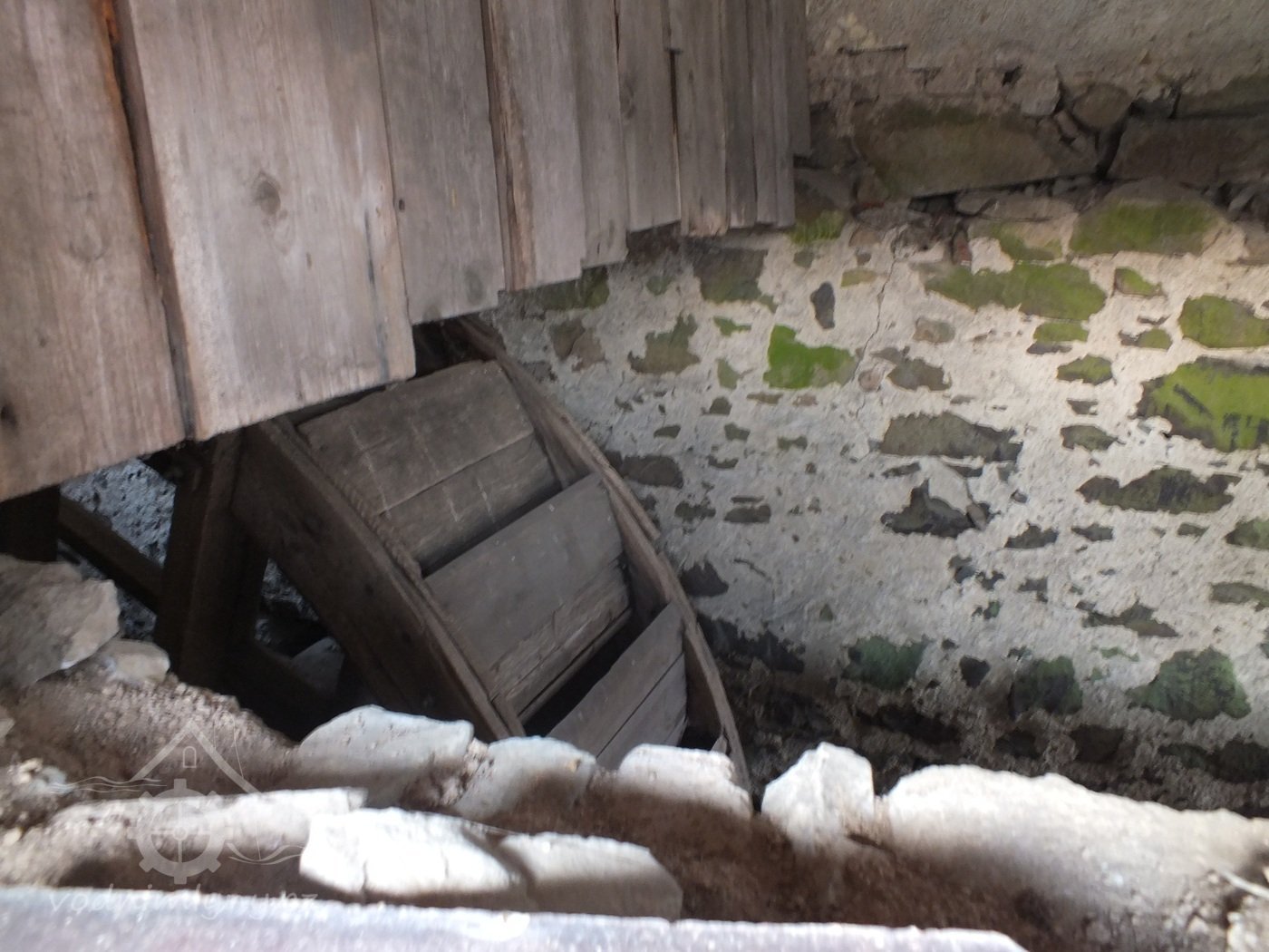 Pohled do lednice na vodní kolo, v popředí patrný prostup pro druhou hřídel vodního kola, 2012, © Šimek