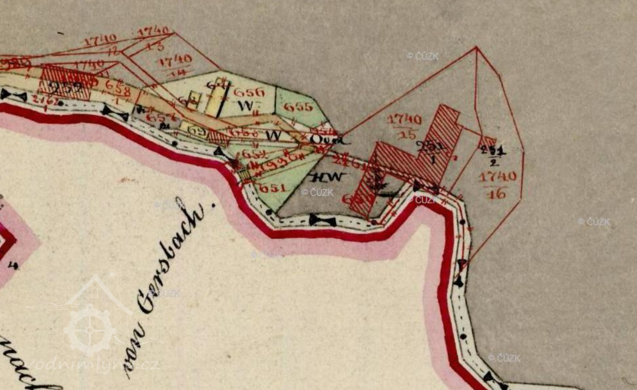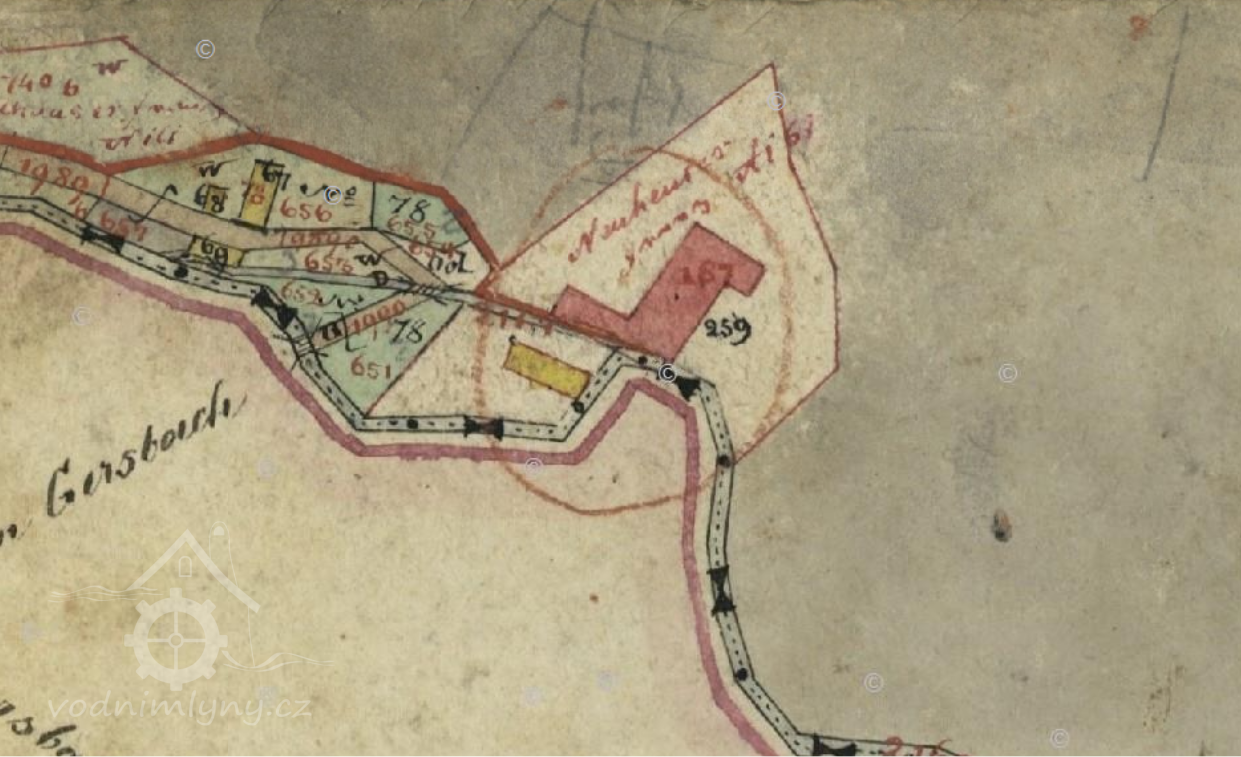 II. vojenské mapování, výřez - průmět mlýnů ve Starých Verneřicích, 1836-1852, © mapire.eu
