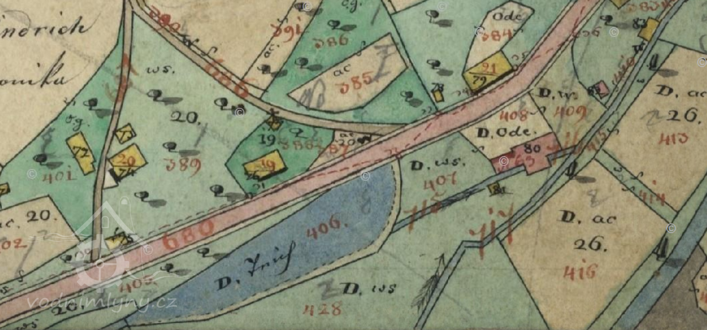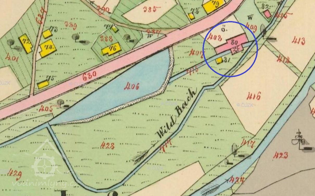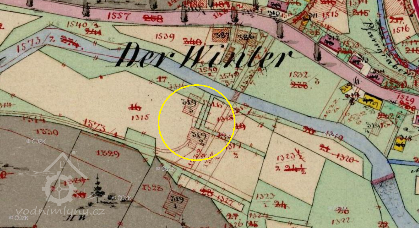 Nákres polohy mlýna, pily a vedení vody, 1884, © SokA Tábor