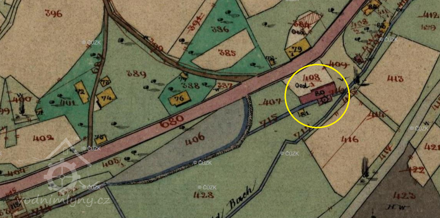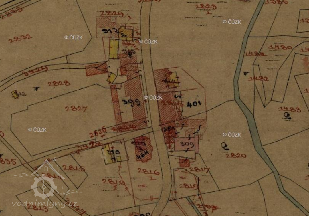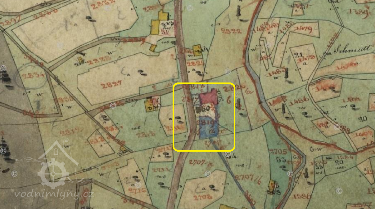 Pohled směrem k mlýništi z cesty, 2013, © viz mapy.cz