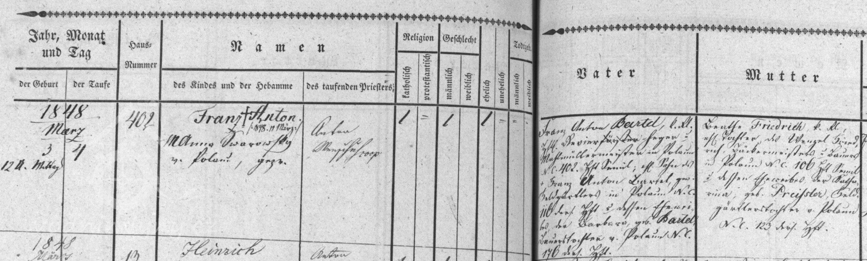 Matriční zápis o narození syna mlynáře Bartela, 1848, © http://www.soalitomerice.cz/