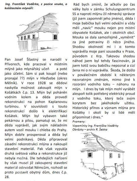 Vzpomínky Ing. Voděrky, vnuka mlynáře Šťastného publikované v košáteckém zpravodaji, nedatováno, © Voděrka
