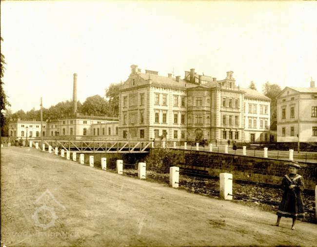 Vlevo Etrichova továrna-bývalý Špitálský mlýn v Trutnově-od západu, nedatováno, © autor neznámý