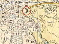 Porovnání současného a stavu cca. počátku 50. let - v ortofotomapě vidíme současné objekty prolnuté s mapou katastrální (červeně - současné pozemkové parcely, žlutě - hospodářská budova, zřejmě pila, zbytky v terénu, modře - plocha náhonu a odtokového kanálu). Parcelace kupodivu odpovídá původnímu členění areálu (šedě - obrysy dle leteckého snímku z cenie). Zdroj: cuzk, cenia, VI. 2016, © PK