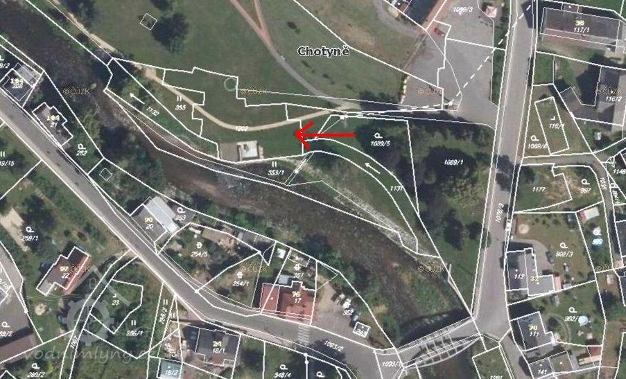 Letecké snímkování a katastrální mapa - místo, kde stával Velký chotyňský mlýn, 2010, © kontaminace.cenia.cz