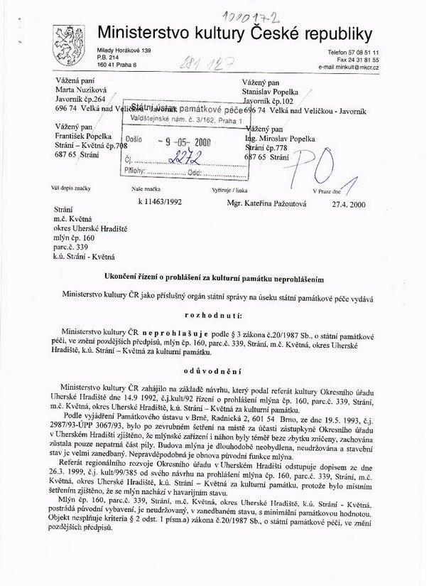 Antonín byl jako mlynář ještě uváděný v r. 1939, po válce už mlýn nemlel, ačkoliv byl po generální opravě a ještě dodnes jsou v něm části mlecí technologie. V roce 1992 se potomci posledního mlynáře snažili, aby byl mlýn vyhlášený za kulturní památku, ale v roce 2000 Ministerstvo kultury ČR toto definitivně zamítlo, protože tam údajně nebylo dostatečné množství dochované technologie. Paradoxně, je to však jediný mlýn ze Strání, který se dochoval fyzicky jako objekt.