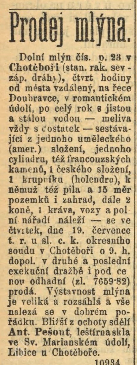 1884 - mlýn nabízen k prodeji, majitel A. Pešout. (RR)