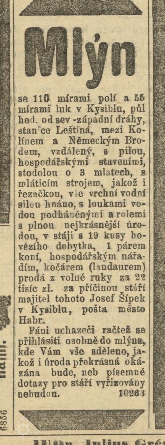 Podle rejstříku k Berní rule z r. 1654 byl ve mlýně Kysibl mlynářem Václav Záděra, mlýn měl 2 kola.