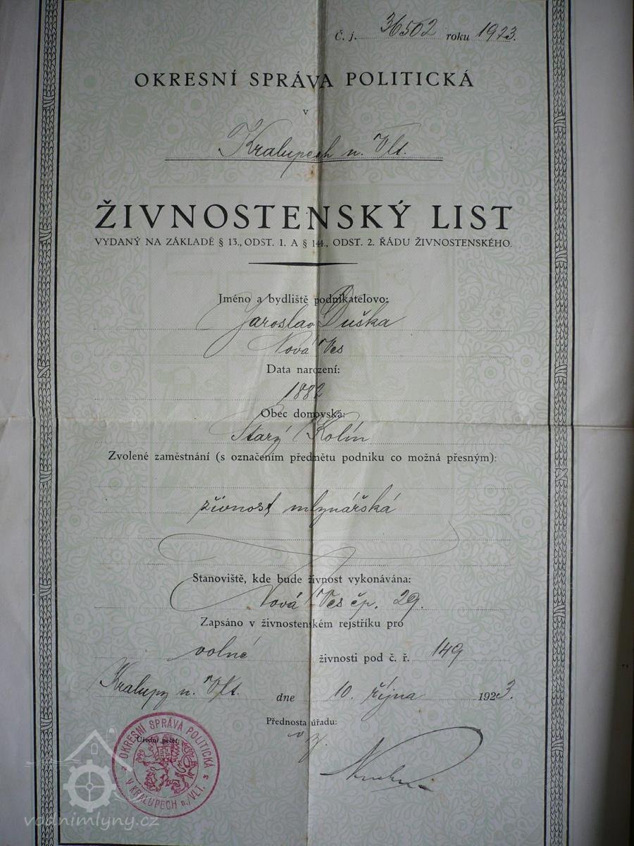 1930 - majitelem mlýna byl Jaroslav Duška (Seznam....)