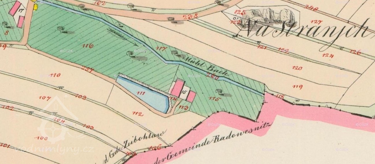 Původně tenhle mlýn býval takový "trucpodnik", postavený v roce 1809 s tím, že bude využívat hlavně vodu stahující se z místních polí a luk na tzv. Dlouhé Lídě. Dlouho nefungoval, později ho dokonce uvádí popisy jako mlýnec na nestálé vodě. (info V. Mátlová, Říčany)