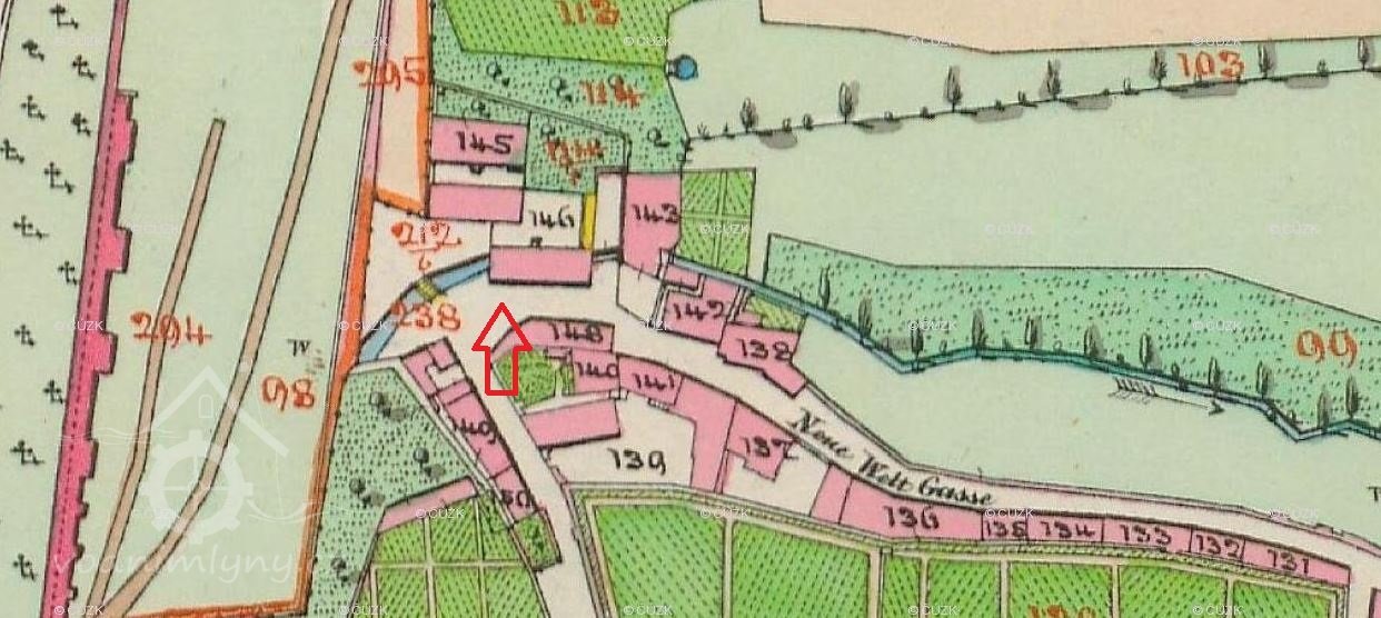 Pravděpodobné místo, kde stál mlýn před stavbou Mariánských hradeb. Při stavbě hradeb byl zbořen.