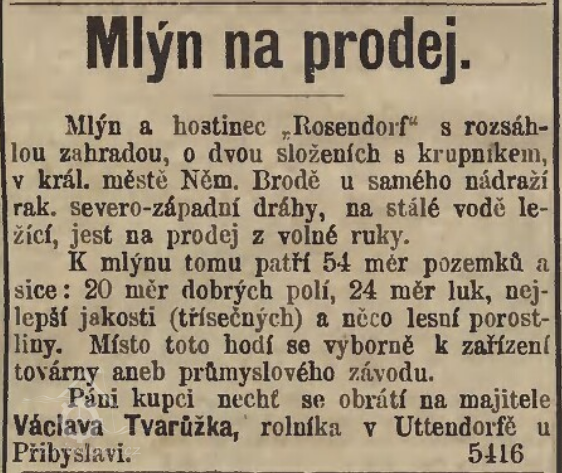 V r. 1880, za majitele Václava Tvarůžka, byl mlýn s hostincem nabízen k prodeji. (RR)